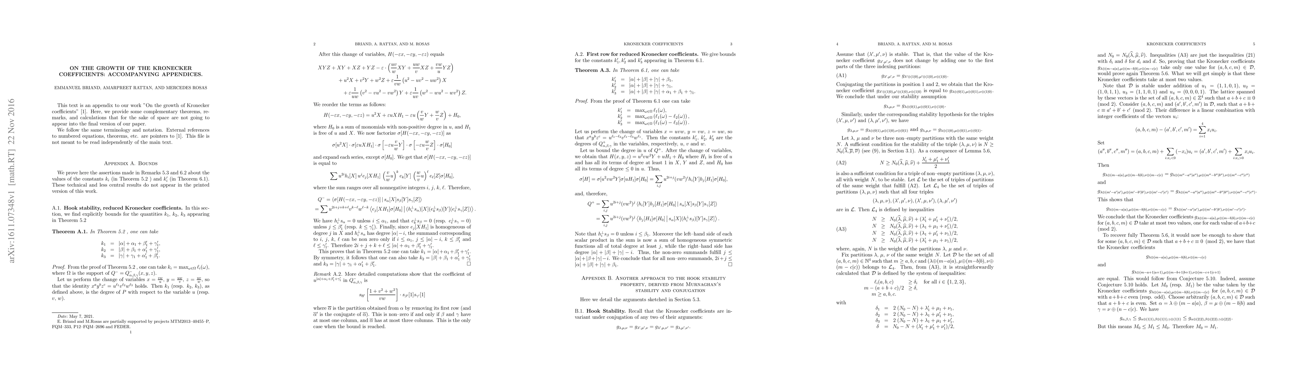This text is an appendix to our work "On the growth of Kronecker coefficients", arXiv:1607.02887. Here, we provide some complementary theorems, remarks, and calculations that for the sake of space are not going to appear into the final version of our paper. We follow the same terminology and notation. External references to numbered equations, theorems, etc. are pointers to arXiv:1607.02887.