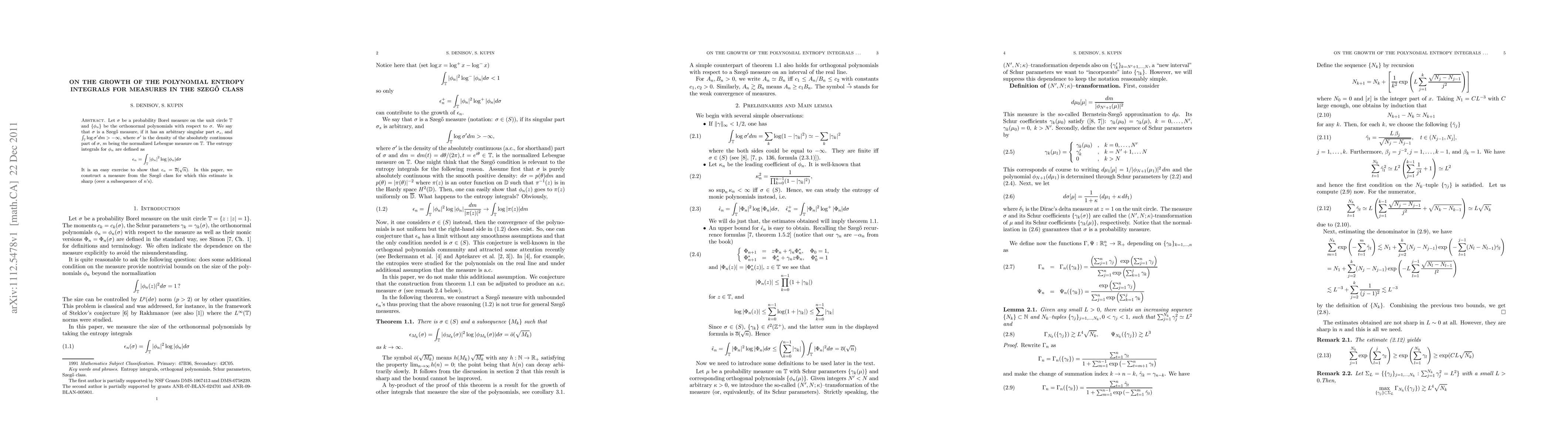 For the polynomials orthogonal on the unit circle with respect to the measure from the Szego class we prove that the polynomial entropy integrals can grow. The estimate obtained is sharp.