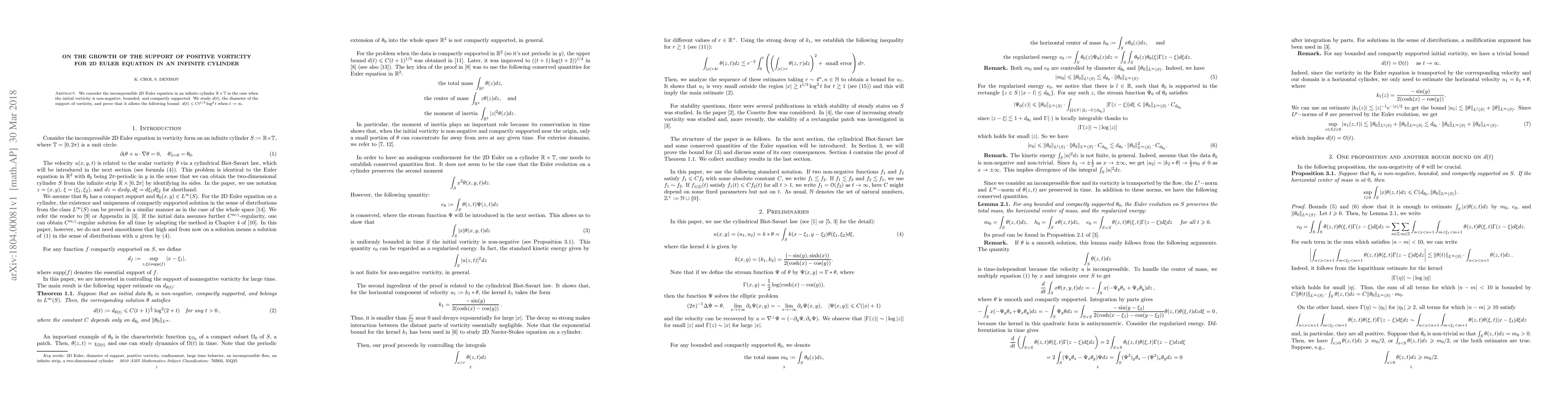This paper investigates the growth of the support of positive vorticity in the 2D Euler equation within an infinite cylinder. It proves that the diameter of the vorticity's support, $d(t)$, is bounded by $Ct^{1/3}\log^2 t$ as time $t$ approaches infinity.