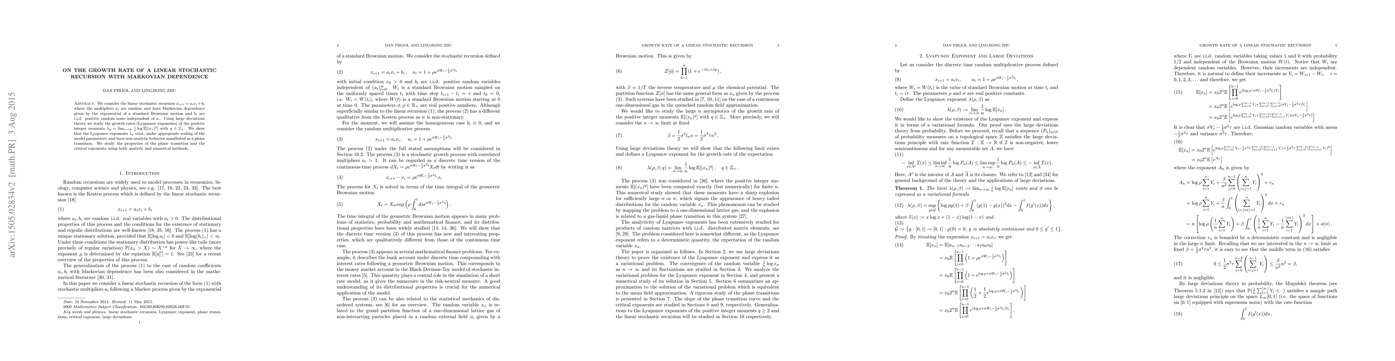 This research paper investigates the growth rate of a linear stochastic recursion with Markovian dependence, finding that it exhibits non-analytic behavior manifesting as a phase transition, which can be studied using both analytic and numerical methods.