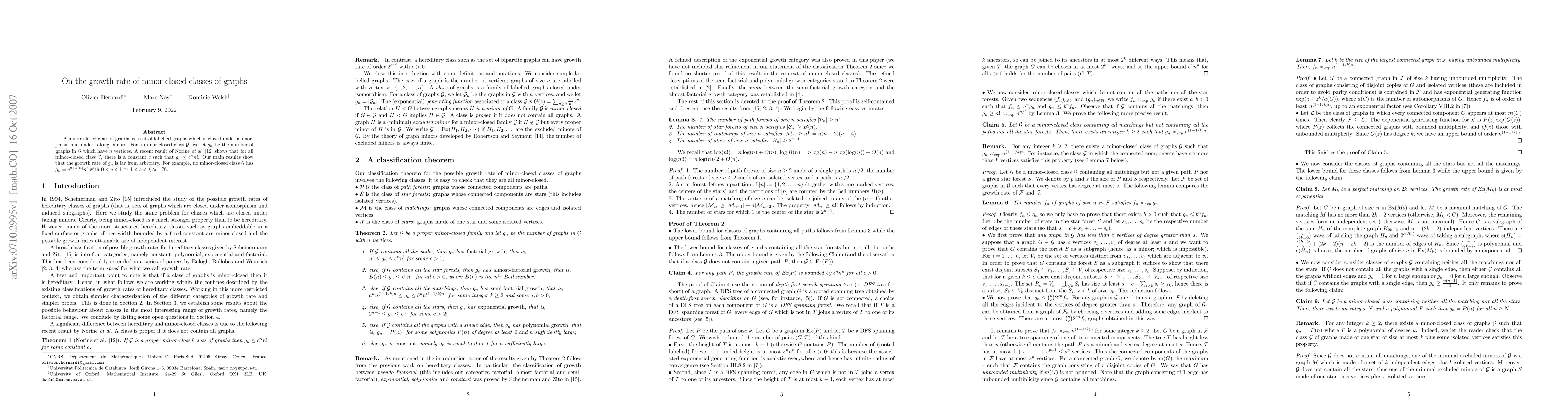 This paper investigates the growth rate of minor-closed classes of graphs, showing that for any such class $C$, the number of graphs with $n$ vertices, $c_n$, is bounded above by $r^n n!$ for some constant $r$. It further demonstrates that $c_n$ cannot grow as $r^{n+o(n)} n!$ for $0 < r < 1$ or $1 < r < \xi$, constraining the possible growth rates significantly.