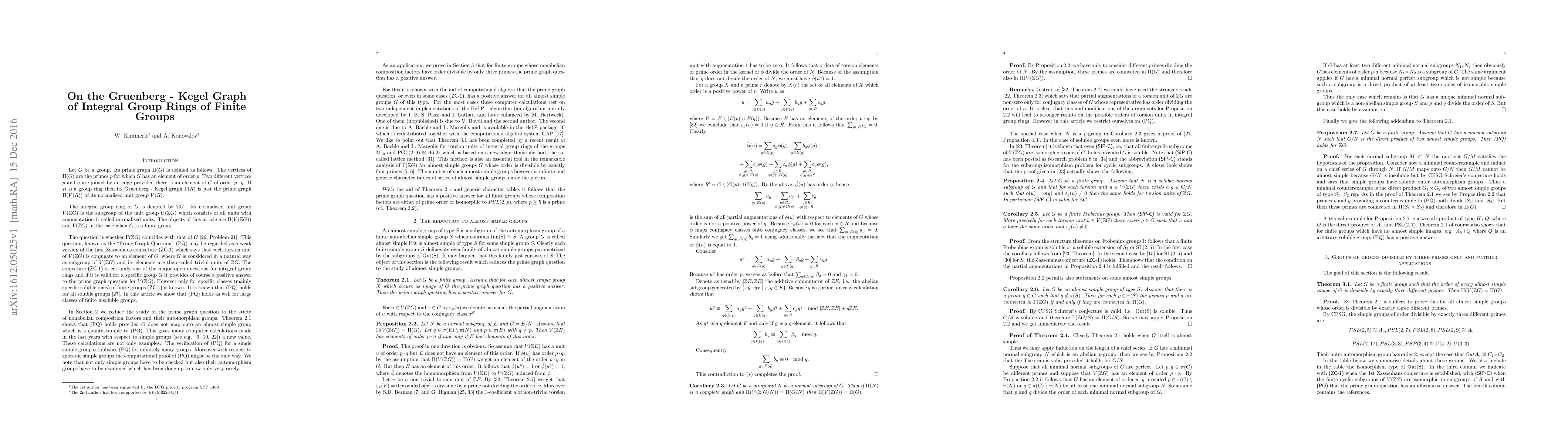 This paper proves that the prime graph of the normalized unit group of the integral group ring $\mathbb{Z}G$ for finite groups $G$ reduces to almost simple groups. It further shows that for $G$ whose order is divisible by at most three primes, the Gruenberg-Kegel graph of $G$ matches the prime graph of $G$.
