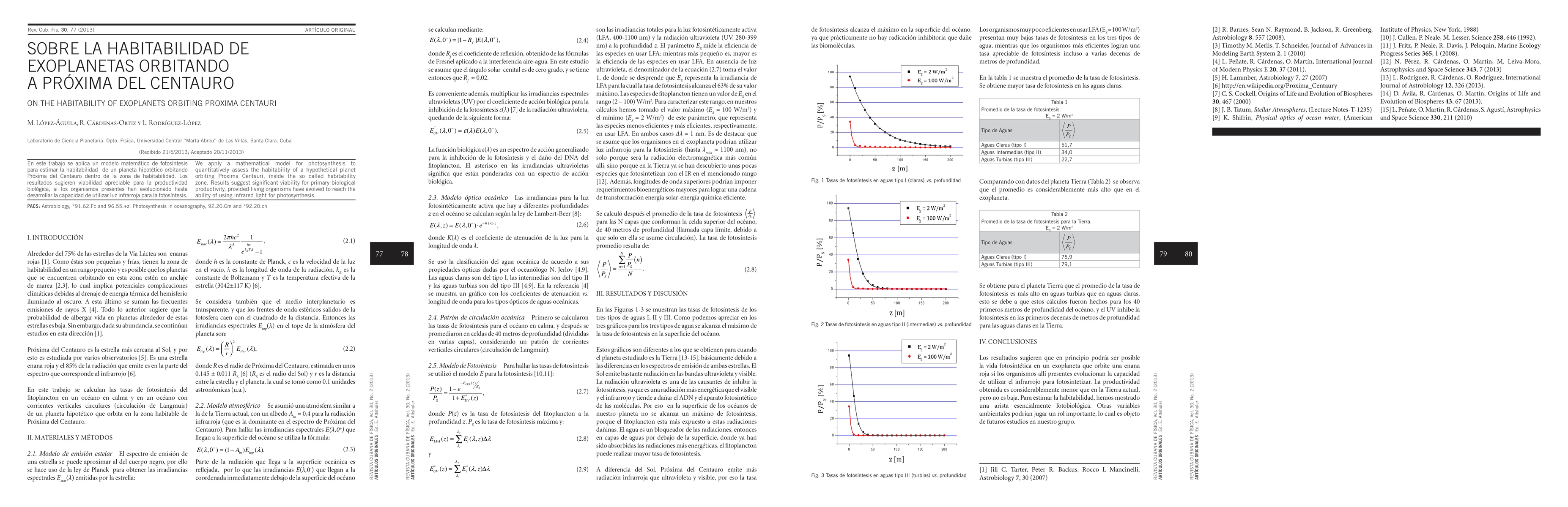 A mathematical model for photosynthesis was applied to assess the habitability of a hypothetical planet orbiting Proxima Centauri within its habitable zone. The study calculated fotosynthetic rates in calm ocean and ocean with circular vertical currents (Langmuir circulation) under varying ocean optical properties (types I, II, and III) and infrared-dominant stellar emission from Proxima Centauri.