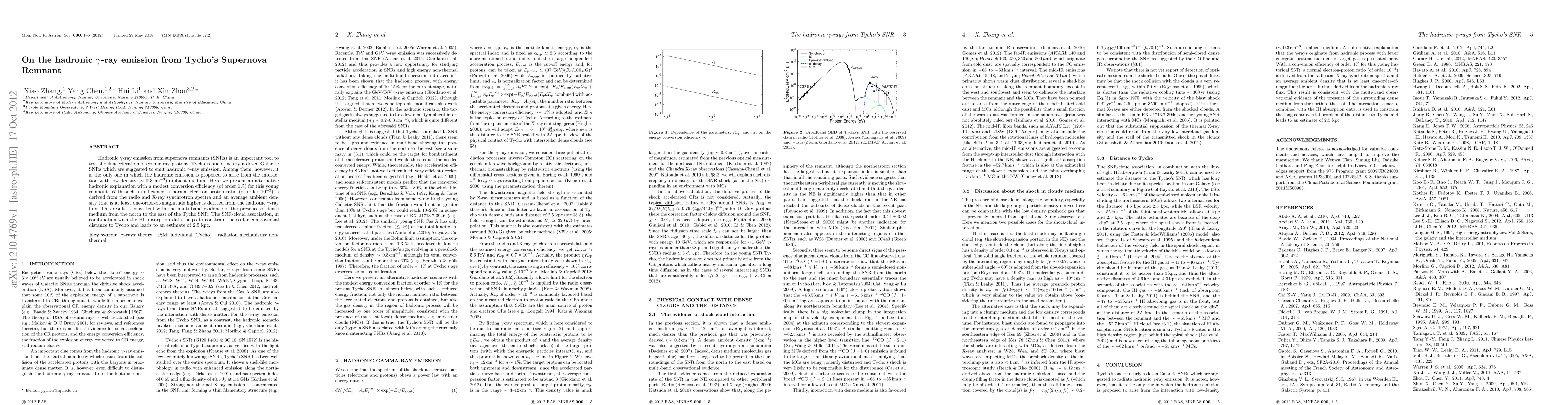 This paper proposes an alternative explanation for the hadronic gamma-ray emission from Tycho's supernova remnant, suggesting a modest conversion efficiency and a higher ambient density than previously assumed. This conclusion supports a closer distance estimate of 2.5 kpc for Tycho.