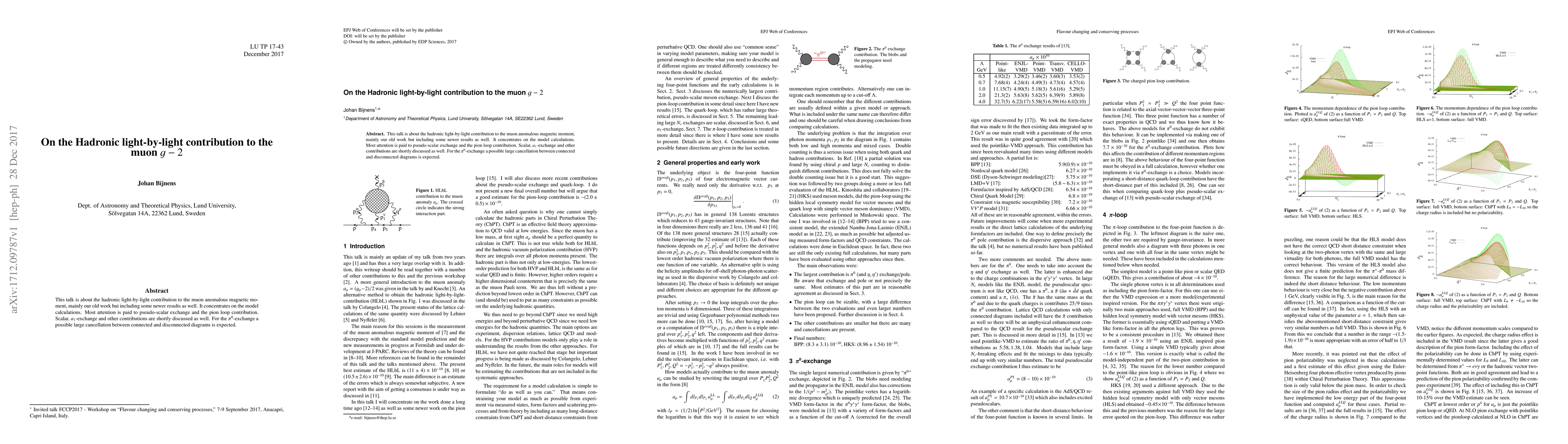 This talk is about the hadronic light-by-light contribution to the muon anomalous magnetic moment, mainly our old work but including some newer results as well. It concentrates on the model calculations. Most attention is paid to pseudo-scalar exchange and the pion loop contribution. Scalar, $a_1$-exchange and other contributions are shortly discussed as well. For the $\pi^0$-exchange a possible large cancellation between connected and disconnected diagrams is expected.
