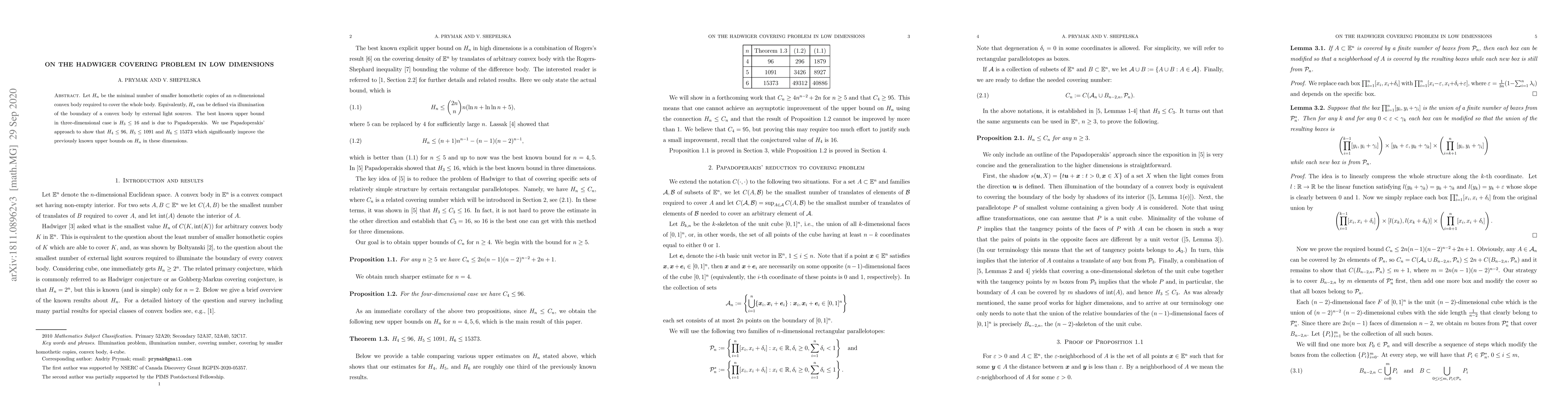 Let $H_n$ be the minimal number of smaller homothetic copies of an $n$-dimensional convex body required to cover the whole body. Equivalently, $H_n$ can be defined via illumination of the boundary of a convex body by external light sources. The best known upper bound in three-dimensional case is $H_3\le 16$ and is due to Papadoperakis. We use Papadoperakis' approach to show that $H_4\le 96$, $H_5\le 1091$ and $H_6\le 15373$ which significantly improve the previously known upper bounds on $H_n$ in these dimensions.