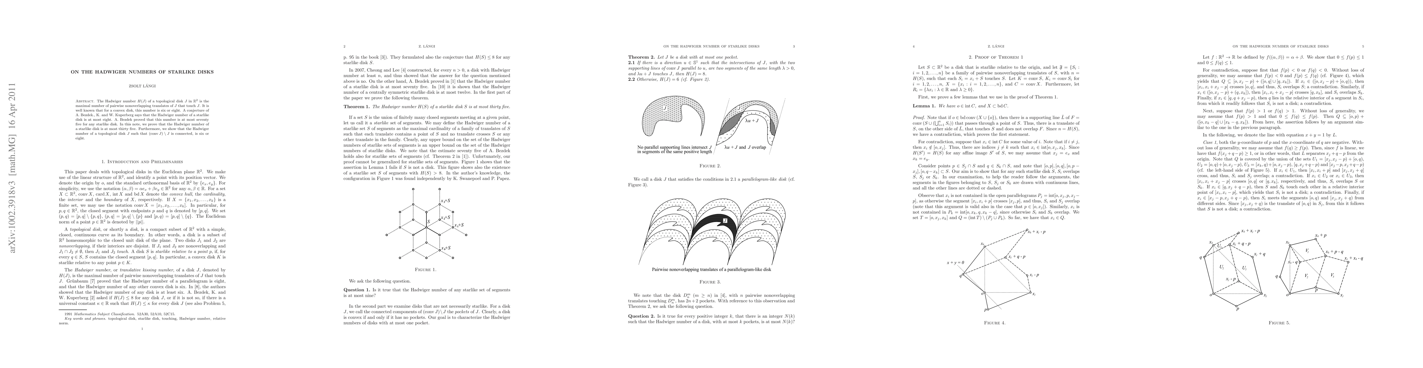 The Hadwiger number $H(J)$ of a topological disk $J$ in $\Re^2$ is the maximal number of pairwise nonoverlapping translates of $J$ that touch $J$. It is well known that for a convex disk, this number is six or eight. A conjecture of A. Bezdek., K. and W. Kuperberg says that the Hadwiger number of a starlike disk is at most eight. A. Bezdek proved that this number is at most seventy five for any starlike disk. In this note, we prove that the Hadwiger number of a starlike disk is at most thirty five. Furthermore, we show that the Hadwiger number of a topological disk $J$ such that $(\conv J) \setminus J$ is connected, is six or eight.