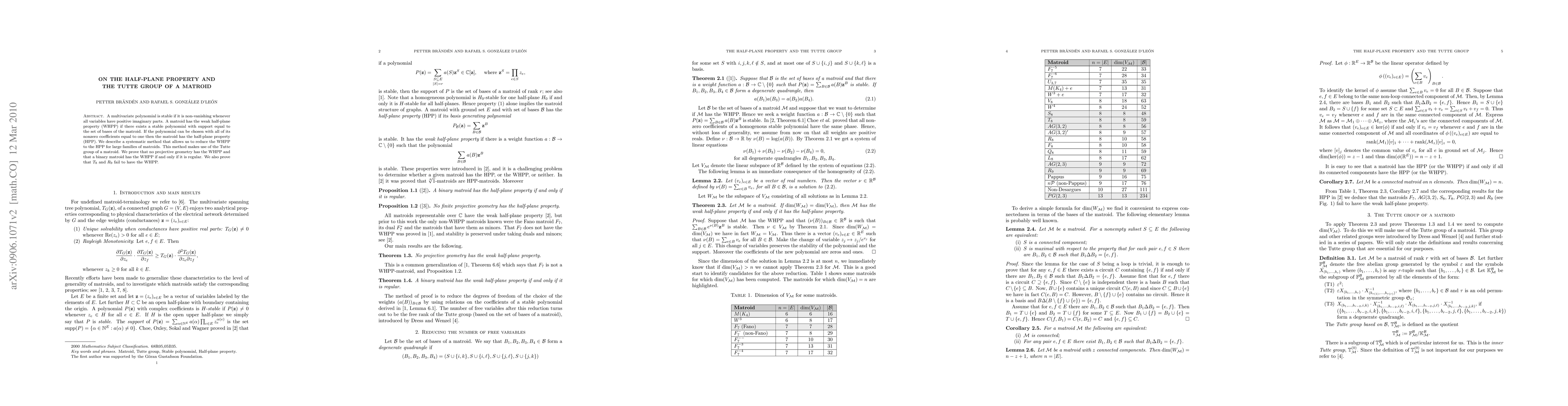 A multivariate polynomial is stable if it is non-vanishing whenever all variables have positive imaginary parts. A matroid has the weak half-plane property (WHPP) if there exists a stable polynomial with support equal to the set of bases of the matroid. If the polynomial can be chosen with all of its nonzero coefficients equal to one then the matroid has the half-plane property (HPP). We describe a systematic method that allows us to reduce the WHPP to the HPP for large families of matroids. This method makes use of the Tutte group of a matroid. We prove that no projective geometry has the WHPP and that a binary matroid has the WHPP if and only if it is regular. We also prove that T_8 and R_9 fail to have the WHPP.