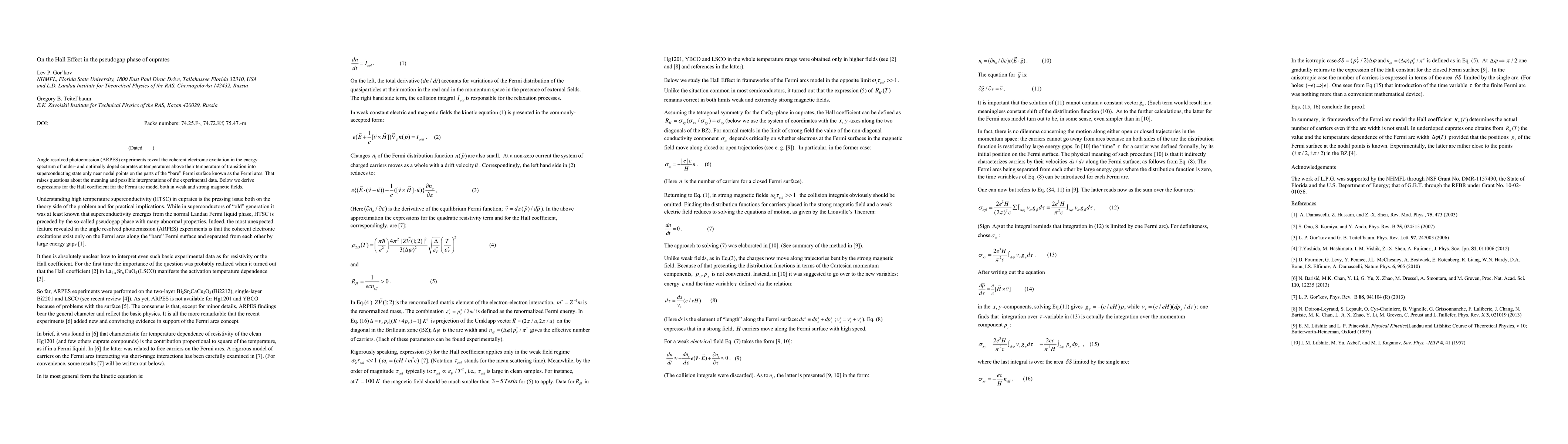 Angle resolved photoemission (ARPES) experiments reveal the coherent electronic excitation in the energy spectrum of under- and optimally doped cuprates at temperatures above their temperature of transition into superconducting state only near nodal points on the parts of the "bare" Fermi surface known as the Fermi arcs. That raises questions about the meaning and possible interpretations of the experimental data. Below we derive expressions for the Hall coefficient for the Fermi arc model both in weak and strong magnetic fields.