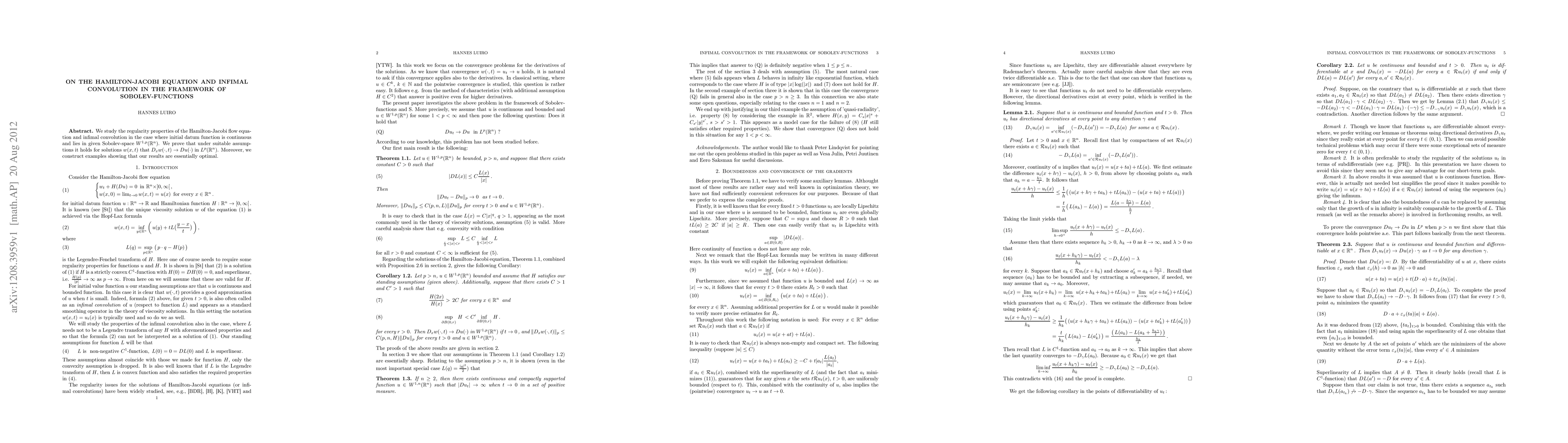 We study the regularity properties of the Hamilton-Jacobi flow equation and infimal convolution in the case where initial datum function is continuous and lies in given Sobolev-space $W^{1,p}(\rn)$. We prove that under suitable assumptions it holds for solutions $w(x,t)$ that $D_xw(\cdot,t)\to Du(\cdot)$ in $L^p(\rn)$. Moreover, we construct examples showing that our results are essentially optimal.