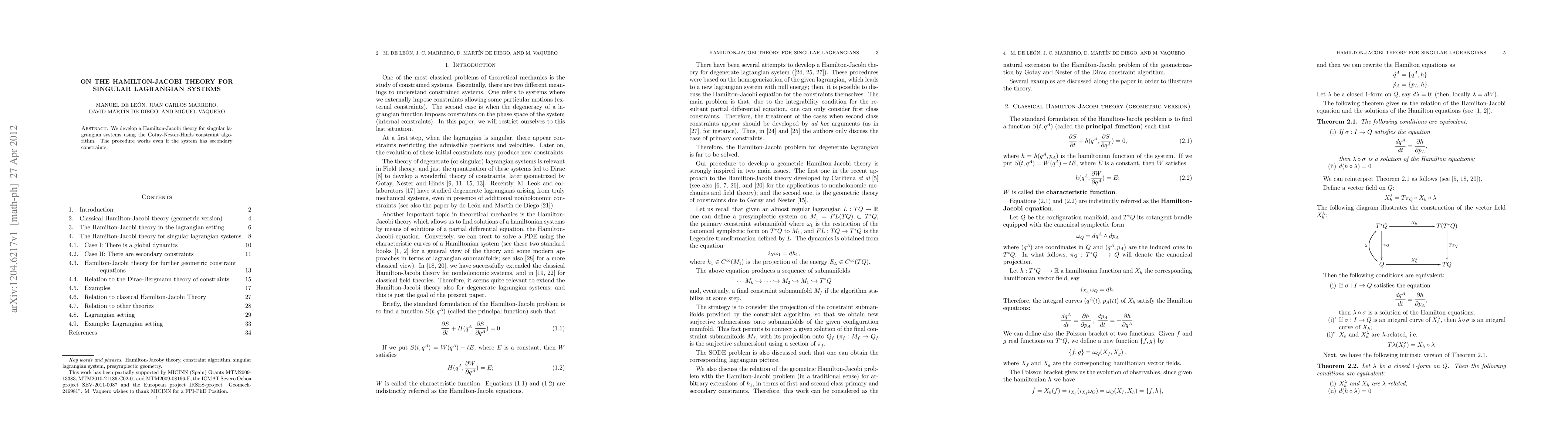 Summary: This paper develops a Hamilton-Jacobi theory for singular Lagrangian systems utilizing the Gotay-Nester-Hinds constraint algorithm, capable of handling secondary constraints within the framework.