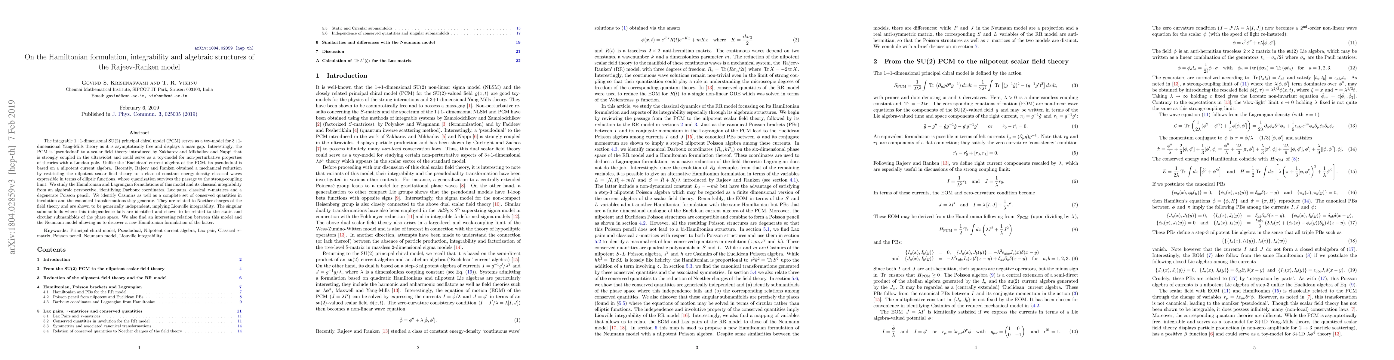 The integrable 1+1-dimensional SU(2) principal chiral model (PCM) serves as a toy-model for 3+1-dimensional Yang-Mills theory as it is asymptotically free and displays a mass gap. Interestingly, the PCM is 'pseudodual' to a scalar field theory introduced by Zakharov and Mikhailov and Nappi that is strongly coupled in the ultraviolet and could serve as a toy-model for non-perturbative properties of theories with a Landau pole. Unlike the 'Euclidean' current algebra of the PCM, its pseudodual is based on a nilpotent current algebra. Recently, Rajeev and Ranken obtained a mechanical reduction by restricting the nilpotent scalar field theory to a class of constant energy-density classical waves expressible in terms of elliptic functions, whose quantization survives the passage to the strong-coupling limit. We study the Hamiltonian and Lagrangian formulations of this model and its classical integrability from an algebraic perspective, identifying Darboux coordinates, Lax pairs, classical r-matrices and a degenerate Poisson pencil. We identify Casimirs as well as a complete set of conserved quantities in involution and the canonical transformations they generate. They are related to Noether charges of the field theory and are shown to be generically independent, implying Liouville integrability. The singular submanifolds where this independence fails are identified and shown to be related to the static and circular submanifolds of the phase space. We also find an interesting relation between this model and the Neumann model allowing us to discover a new Hamiltonian formulation of the latter.