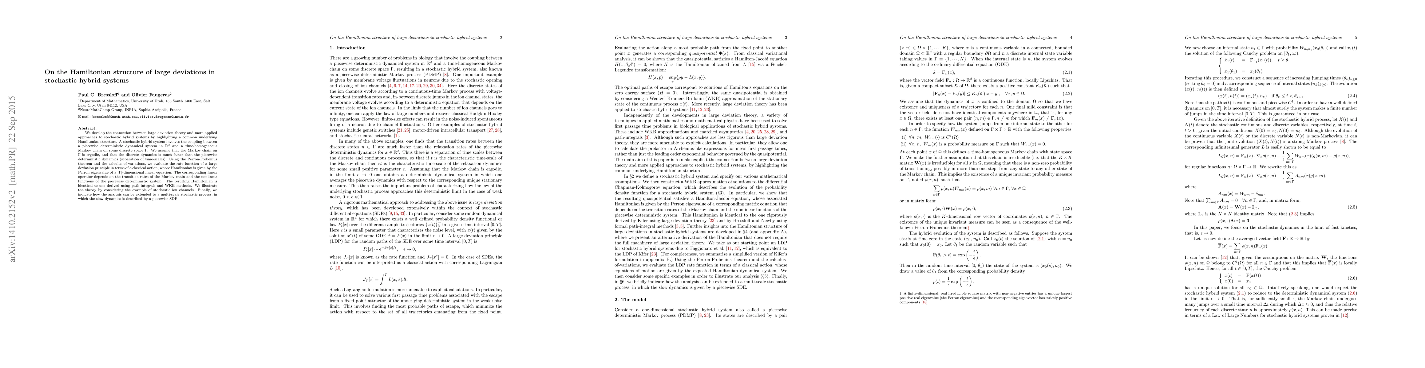 Researchers connect large deviation theory to stochastic hybrid systems by identifying a common Hamiltonian structure, enabling efficient analysis of system behavior in extreme conditions. The findings provide a mathematical framework for understanding complex systems, such as ion channels, using path-integrals and WKB methods.