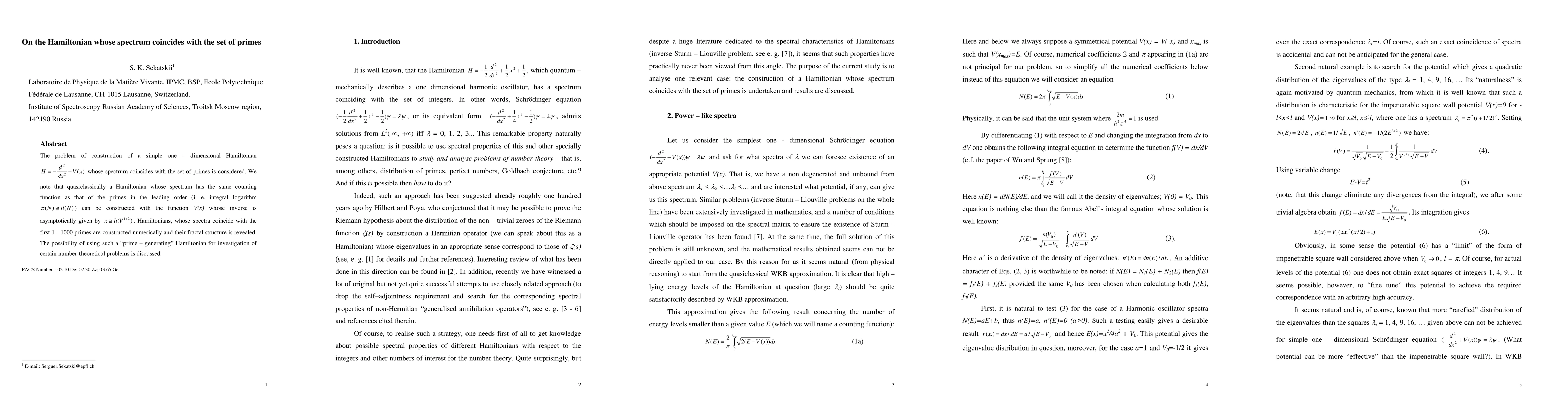 This paper explores the construction of a one-dimensional Hamiltonian whose spectrum matches the set of prime numbers. It presents a quasiclassical Hamiltonian with a potential function that asymptotically inverts the integral logarithm, and numerically constructs Hamiltonians for the first 1-1000 primes, revealing their fractal structure and discussing potential applications to number-theoretical problems.