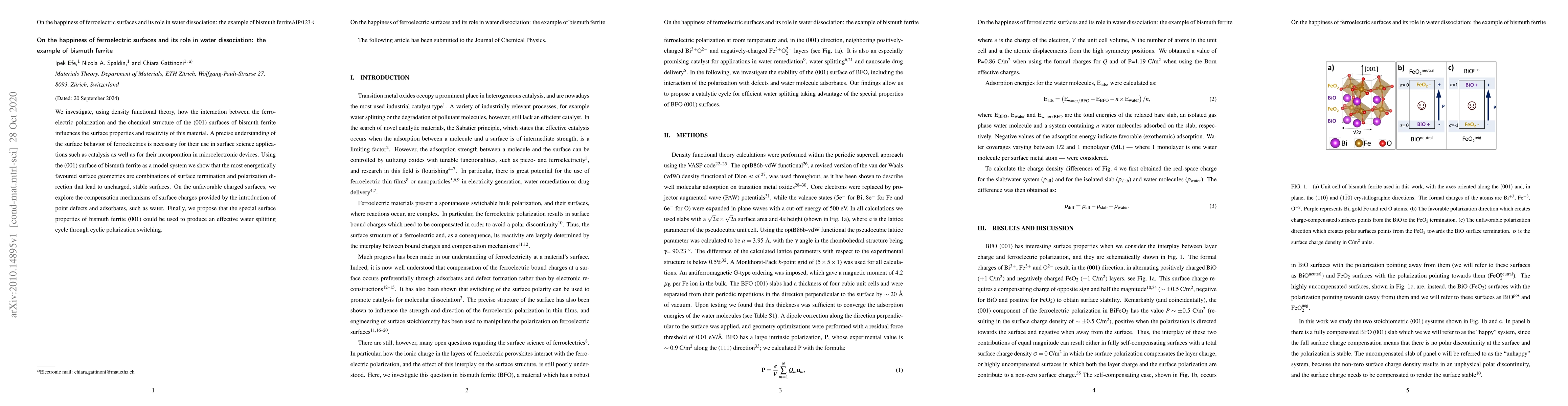 We investigate, using density functional theory, how the interaction between the ferroelectric polarization and the chemical structure of the (001) surfaces of bismuth ferrite influences the surface properties and reactivity of this material. A precise understanding ofthe surface behavior of ferroelectrics is necessary for their use in surface science applications such as catalysis as well as for their incorporation in microelectronic devices. Using the (001) surface of bismuth ferrite as a model system we show that the most energetically favoured surface geometries are combinations of surface termination and polarization direction that lead to uncharged, stable surfaces. On the unfavorable charged surfaces, we explore the compensation mechanisms of surface charges provided by the introduction of point defects and adsorbates, such as water. Finally, we propose that the special surface properties of bismuth ferrite (001) could be used to produce an effective water splitting cycle through cyclic polarization switching.
