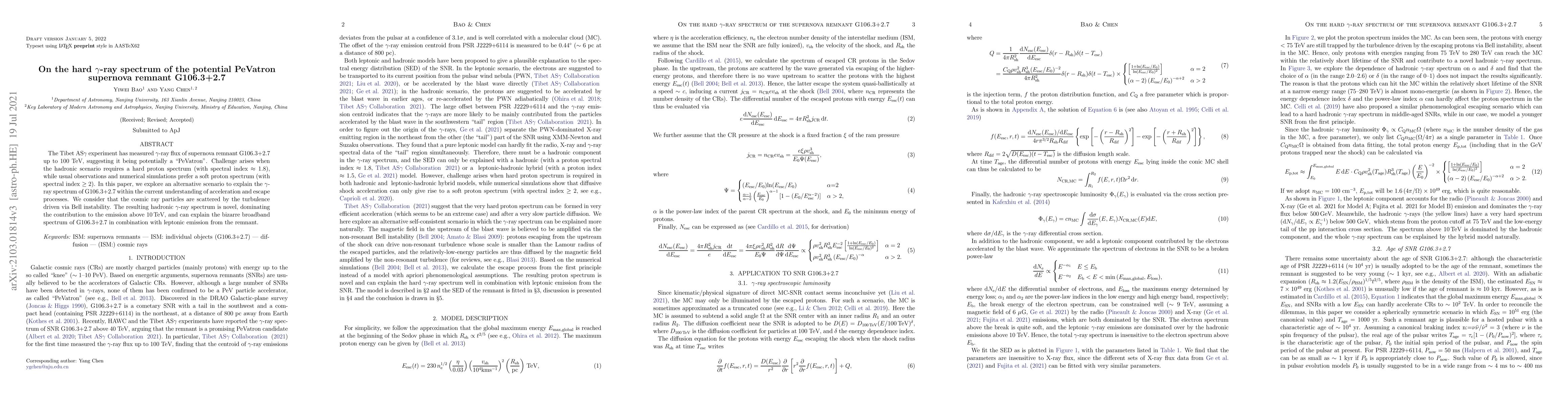 The Tibet AS$\gamma$ experiment has measured $\gamma$-ray flux of supernova remnant G106.3+2.7 up to 100 TeV, suggesting it {being} potentially a "PeVatron". Challenge arises when the hadronic scenario requires a hard proton spectrum (with spectral index $\approx 1.8$), while {usual observations and numerical simulations prefer} a soft proton spectrum {(with spectral index $\geq 2$)}. In this paper, we explore an alternative scenario to explain the $\gamma$-ray spectrum of G106.3+2.7 within the current understanding of acceleration and escape processes. We consider that the cosmic ray {particles} are scattered by the turbulence driven via Bell instability. The resulting hadronic $\gamma$-ray spectrum is novel, dominating the contribution to the emission above 10\,TeV, and can explain the bizarre broadband spectrum of G106.3+2.7 in combination with leptonic emission from the remnant.