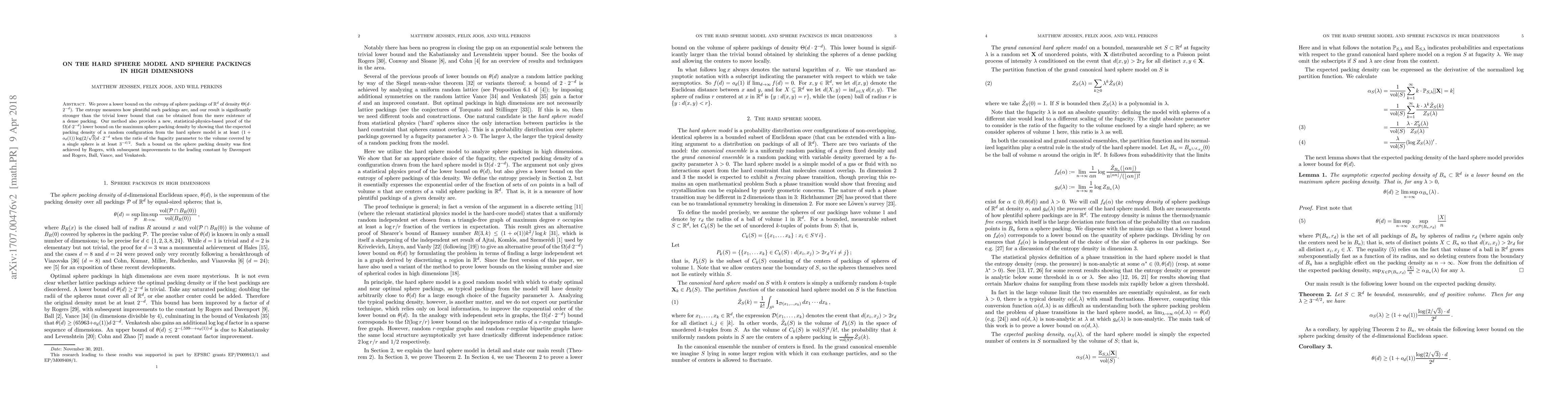 This paper establishes a stronger lower bound on the entropy of sphere packings in high-dimensional spaces, significantly surpassing trivial bounds. It also provides a statistical-physics-based proof for the $\Omega(d \cdot 2^{-d})$ lower bound on the maximum sphere packing density.