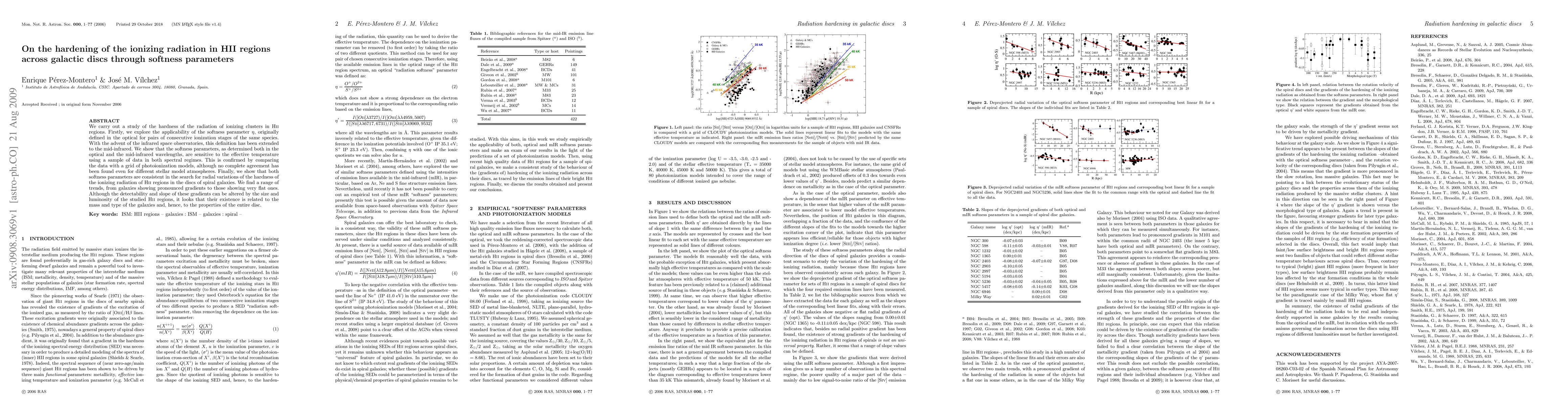 This study investigates the hardness of ionizing radiation in HII regions using softness parameters, showing their sensitivity to effective temperature across optical and mid-infrared wavelengths. It finds varying radial gradients in ionizing radiation hardness across spiral galaxies, suggesting these gradients relate to the mass and type of the galaxies.