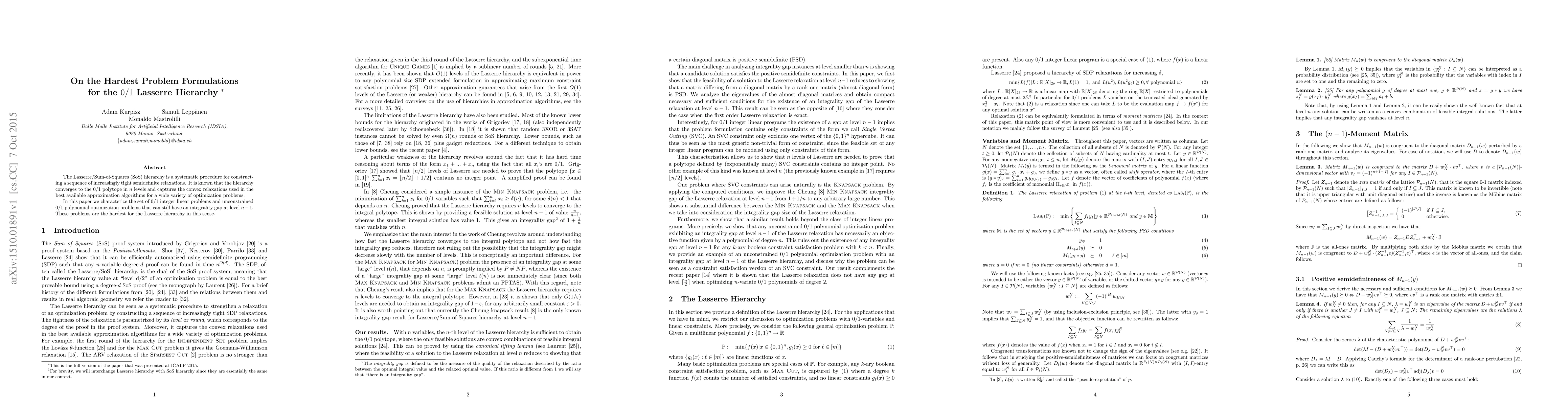 The Lasserre/Sum-of-Squares (SoS) hierarchy is a systematic procedure for constructing a sequence of increasingly tight semidefinite relaxations. It is known that the hierarchy converges to the 0/1 polytope in n levels and captures the convex relaxations used in the best available approximation algorithms for a wide variety of optimization problems. In this paper we characterize the set of 0/1 integer linear problems and unconstrained 0/1 polynomial optimization problems that can still have an integrality gap at level n-1. These problems are the hardest for the Lasserre hierarchy in this sense.