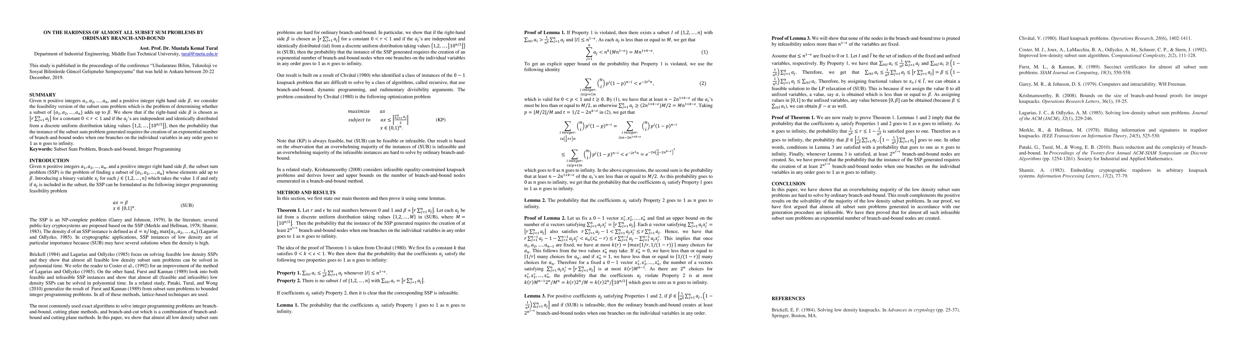 This paper demonstrates that for randomly generated subset sum problems with specific parameters, the likelihood of requiring an exponential number of branch-and-bound nodes approaches 1 as the number of integers increases, indicating the problem's inherent computational difficulty.