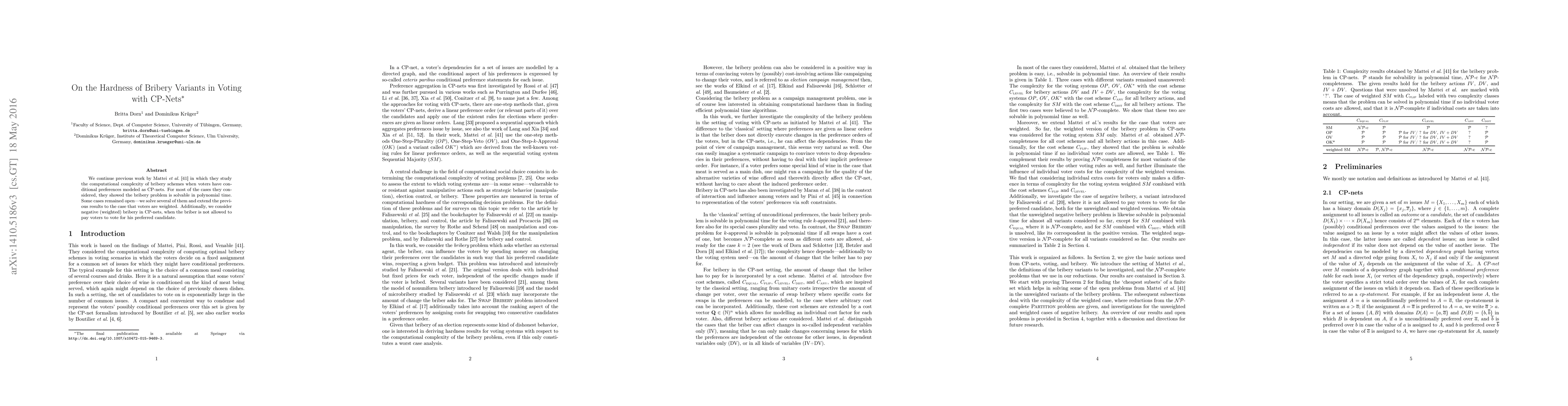 Researchers solved two open cases on bribery in voting with Conditional Preference Networks (CP-nets), extending previous results to weighted voters and negative bribery scenarios.