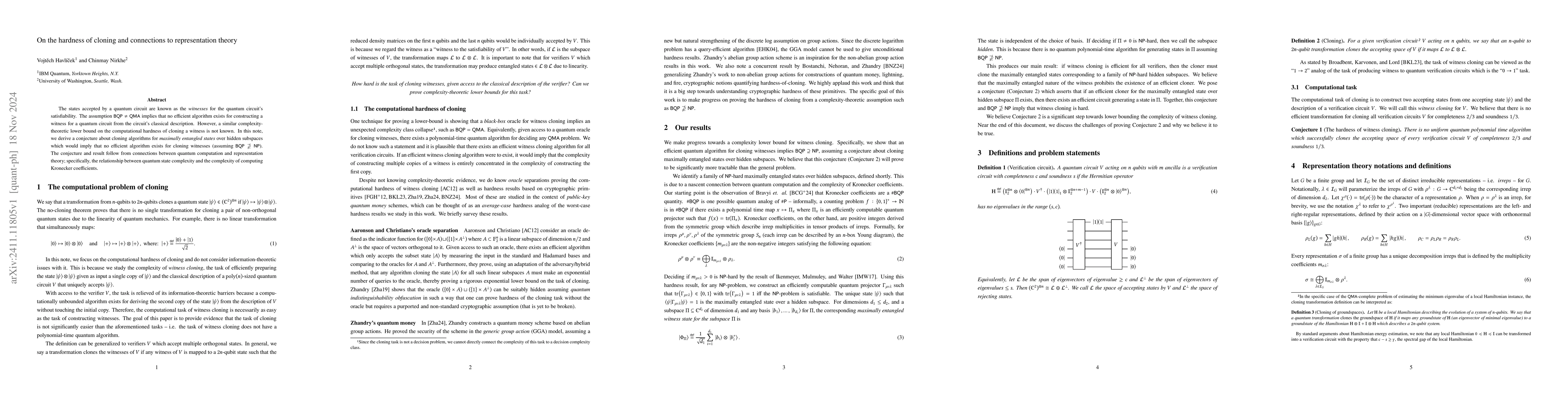 This paper explores the computational hardness of cloning quantum witnesses, proposing a conjecture based on connections between quantum state complexity and representation theory, specifically the difficulty of computing Kronecker coefficients, which implies no efficient cloning algorithm exists if BQP does not contain NP.