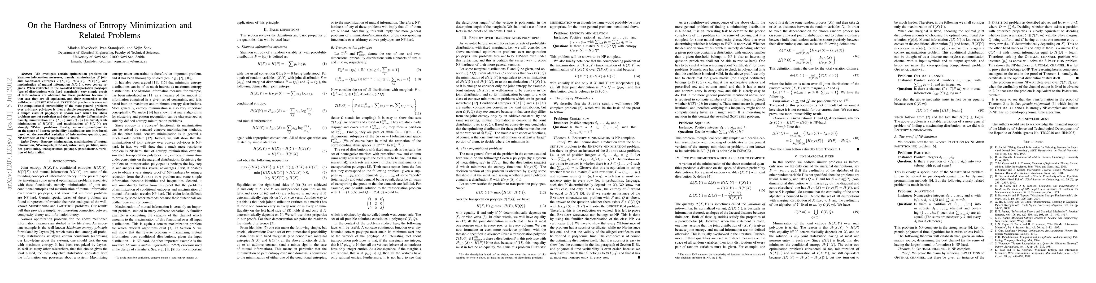 This paper explores the computational complexity of minimizing joint and conditional entropies and maximizing mutual information within convex regions, particularly over transportation polytopes. It demonstrates NP-hardness for these problems, revealing their equivalence and connection to Subset sum and Partition problems, and highlights differing complexities for specific polytopes.