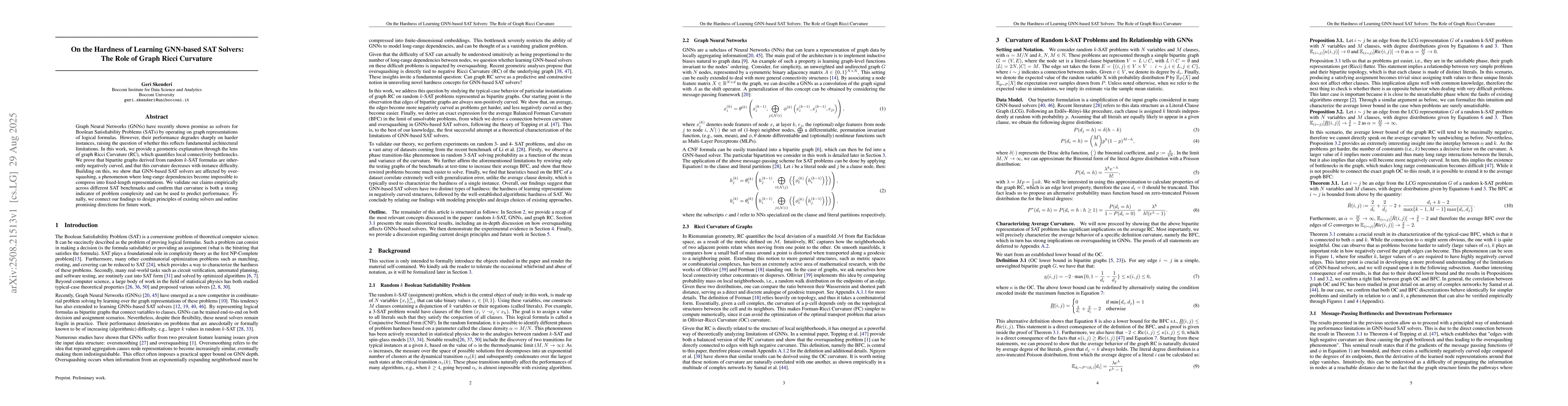 Graph Neural Networks (GNNs) have recently shown promise as solvers for Boolean Satisfiability Problems (SATs) by operating on graph representations of logical formulas. However, their performance degrades sharply on harder instances, raising the question of whether this reflects fundamental architectural limitations. In this work, we provide a geometric explanation through the lens of graph Ricci Curvature (RC), which quantifies local connectivity bottlenecks. We prove that bipartite graphs derived from random k-SAT formulas are inherently negatively curved, and that this curvature decreases with instance difficulty. Building on this, we show that GNN-based SAT solvers are affected by oversquashing, a phenomenon where long-range dependencies become impossible to compress into fixed-length representations. We validate our claims empirically across different SAT benchmarks and confirm that curvature is both a strong indicator of problem complexity and can be used to predict performance. Finally, we connect our findings to design principles of existing solvers and outline promising directions for future work.