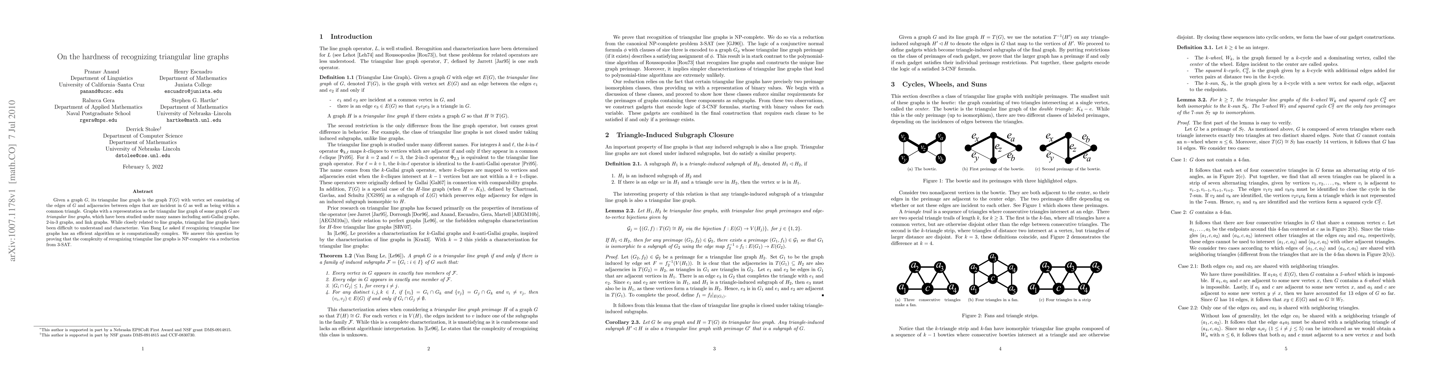 This paper proves that recognizing triangular line graphs is NP-complete through a reduction from 3-SAT. The study addresses the difficulty in understanding and characterizing these graphs, which are also known as anti-Gallai graphs and 2-in-3 graphs.