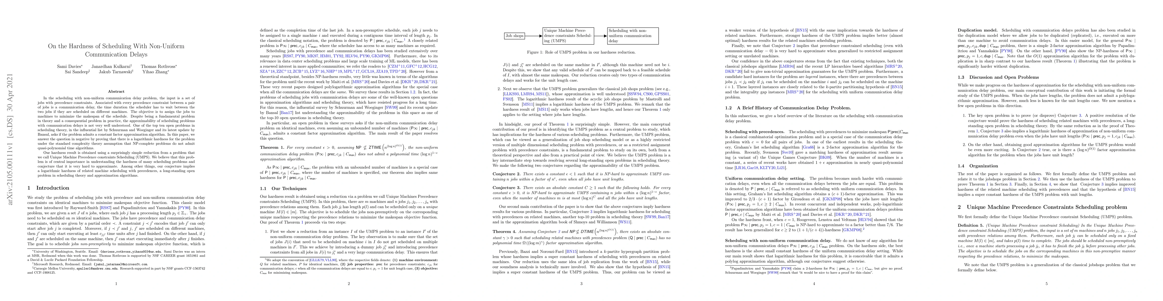 This paper proves that scheduling jobs with non-uniform communication delays is NP-hard to approximate within a logarithmic factor, using a reduction from the Unique Machine Precedence constraints Scheduling (UMPS) problem. The result highlights the complexity of this fundamental scheduling problem and suggests it is very hard to approximate.