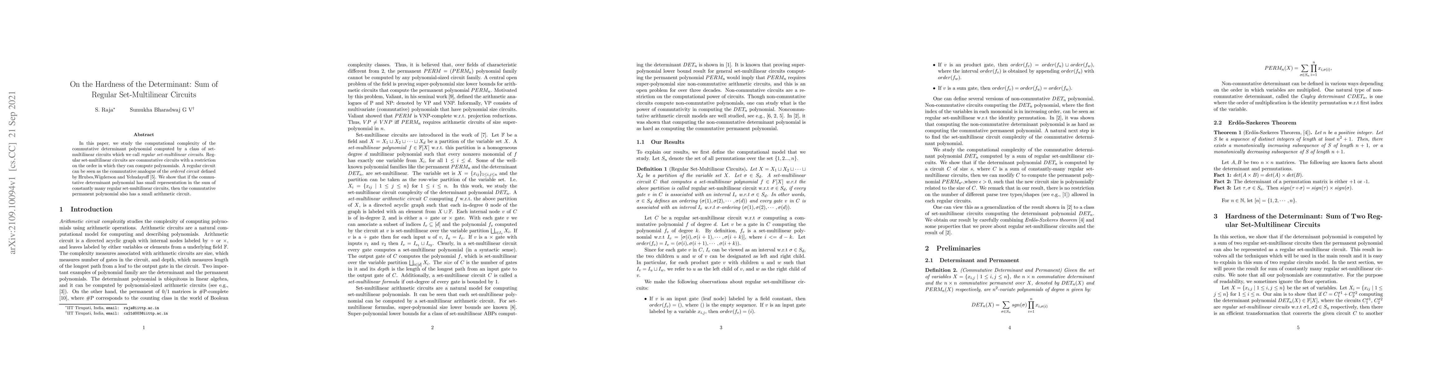 This paper investigates the computational complexity of the commutative determinant computed by regular set-multilinear circuits, establishing a connection between small representations of the determinant in these circuits and the complexity of the commutative permanent.
