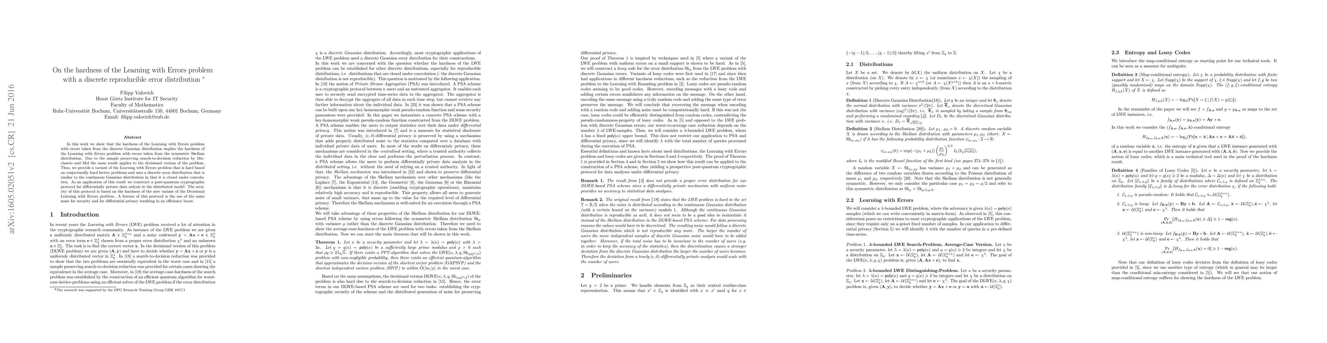 In this work we show that the hardness of the Learning with Errors problem with errors taken from the discrete Gaussian distribution implies the hardness of the Learning with Errors problem with errors taken from the symmetric Skellam distribution. Due to the sample preserving search-to-decision reduction by Micciancio and Mol the same result applies to the decisional version of the problem. Thus, we provide a variant of the Learning with Errors problem that is hard based on conjecturally hard lattice problems and uses a discrete error distribution that is similar to the continuous Gaussian distribution in that it is closed under convolution. As an application of this result we construct a post-quantum cryptographic protocol for differentially private data anlysis in the distributed model. The security of this protocol is based on the hardness of the new variant of the Decisional Learning with Errors problem. A feature of this protocol is the use of the same noise for security and for differential privacy resulting in an efficiency boost.