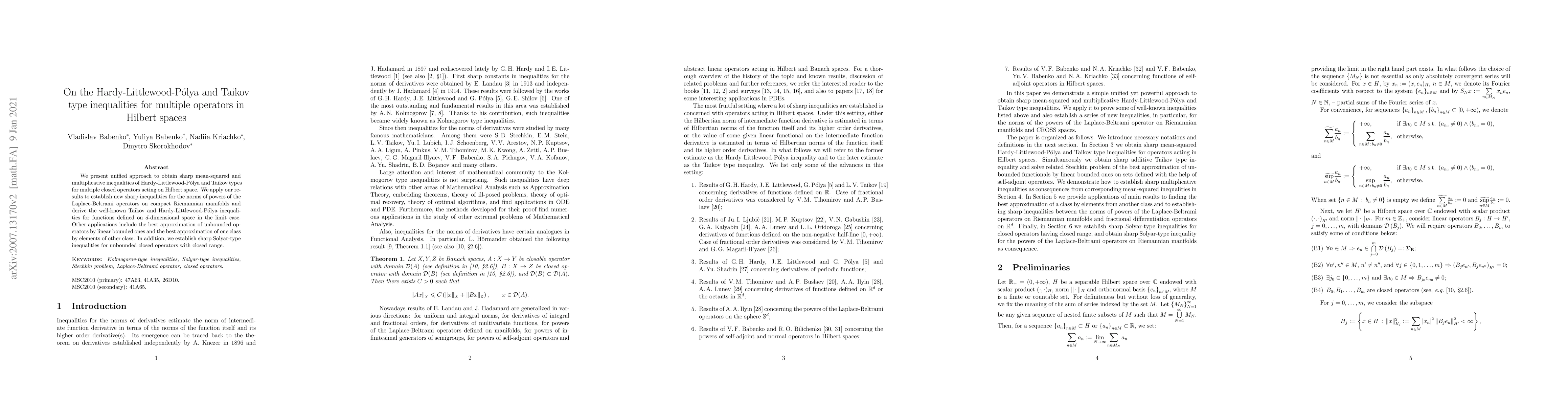 This paper develops a unified method to derive sharp mean-squared and multiplicative inequalities for multiple closed operators in Hilbert spaces, applying these results to obtain new inequalities for the norms of Laplace-Beltrami operators on compact Riemannian manifolds and establishing the Taikov and Hardy-Littlewood-Pólya inequalities for functions in $d$-dimensional space.