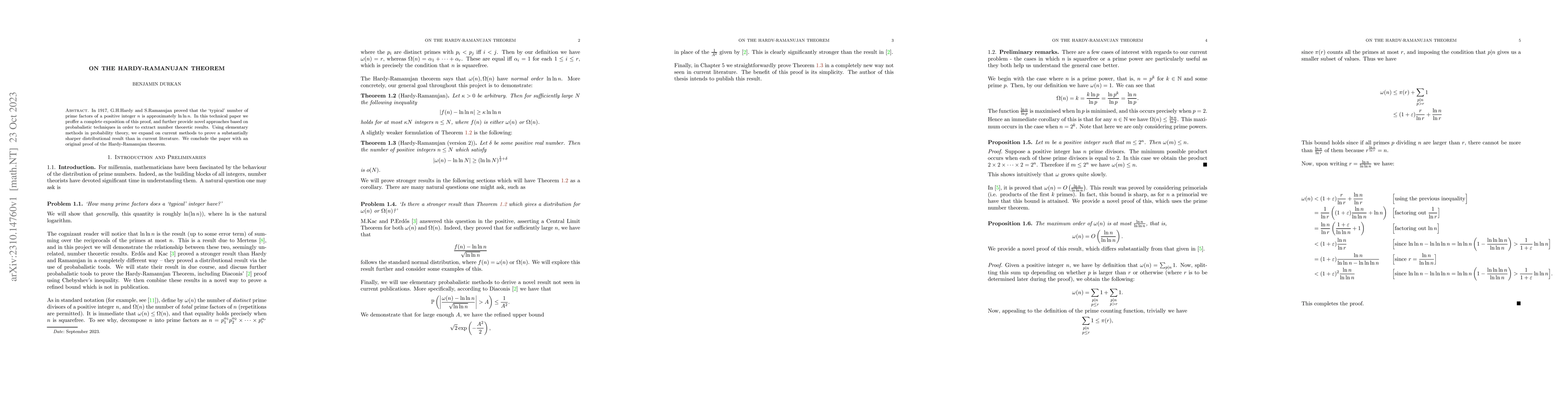 This paper provides a detailed exposition of the Hardy-Ramanujan theorem, which states that the typical number of prime factors of a positive integer is approximately $\ln\ln n$. It also introduces new probabilistic techniques to achieve a sharper distributional result and concludes with an original proof.
