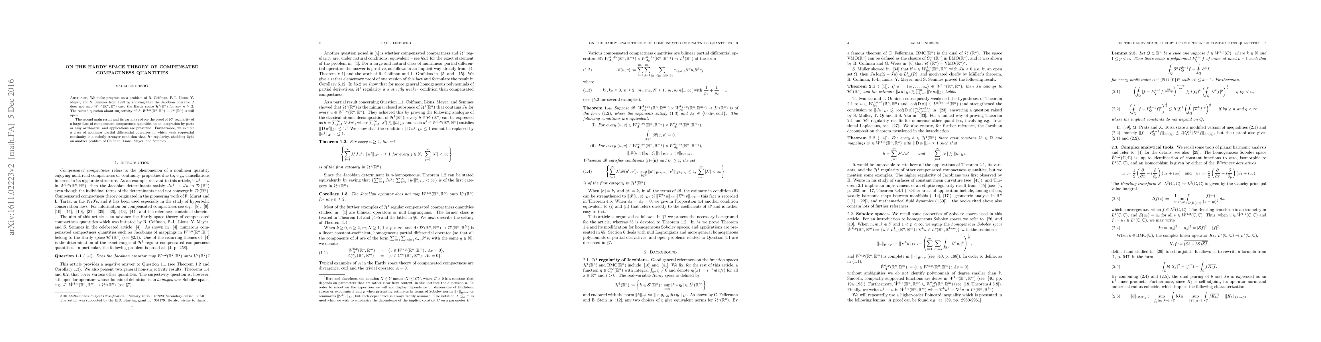 We make progress on a problem of R. Coifman, P.-L. Lions, Y. Meyer, and S. Semmes from 1993 by showing that the Jacobian operator $J$ does not map $W^{1,n}(\mathbb R^n,\mathbb R^n)$ onto the Hardy space $\mathcal{H}^1(\mathbb R^n)$ for any $n \ge 2$. The related question about surjectivity of $J \colon \dot{W}^{1,n}(\mathbb R^n,\mathbb R^n) \to \mathcal{H}^1(\mathbb R^n)$ is still open. The second main result and its variants reduce the proof of $\mathcal{H}^1$ regularity of a large class of compensated compactness quantities to an integration by parts or easy arithmetic, and applications are presented. Furthermore, we exhibit a class of nonlinear partial differential operators in which weak sequential continuity is a strictly stronger condition than $\mathcal{H}^1$ regularity, shedding light on another problem of Coifman, Lions, Meyer, and Semmes.