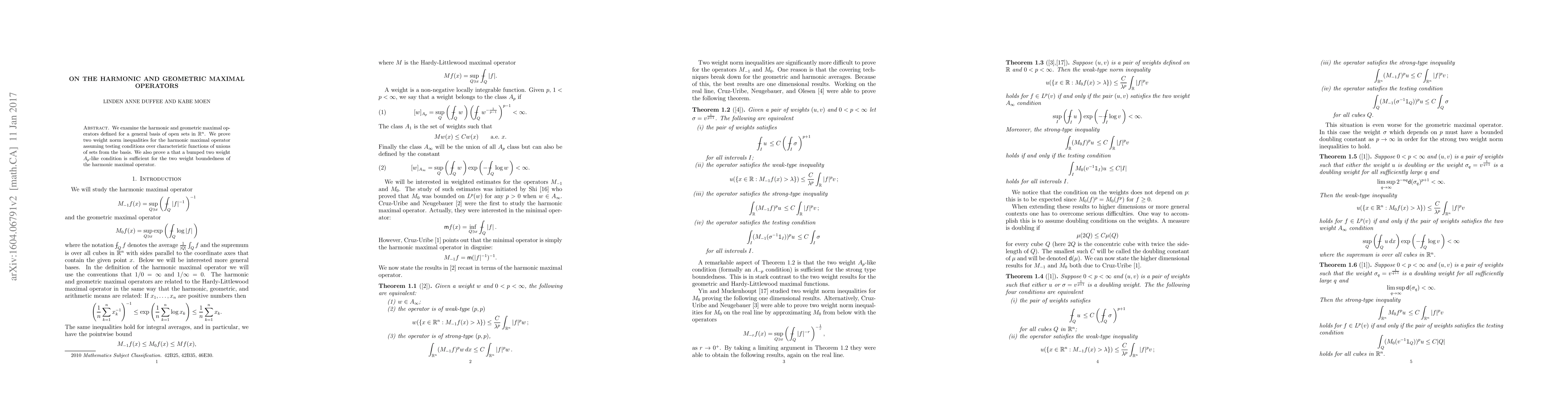 We examine the harmonic and geometric maximal operators defined for a general basis of open sets in $\R^n$. We prove two weight norm inequalities for the harmonic maximal operator assuming testing conditions over characteristic functions of unions of sets from the basis. We also prove a that a bumped two weight $A_p$-like condition is sufficient for the two weight boundedness of the harmonic maximal operator.