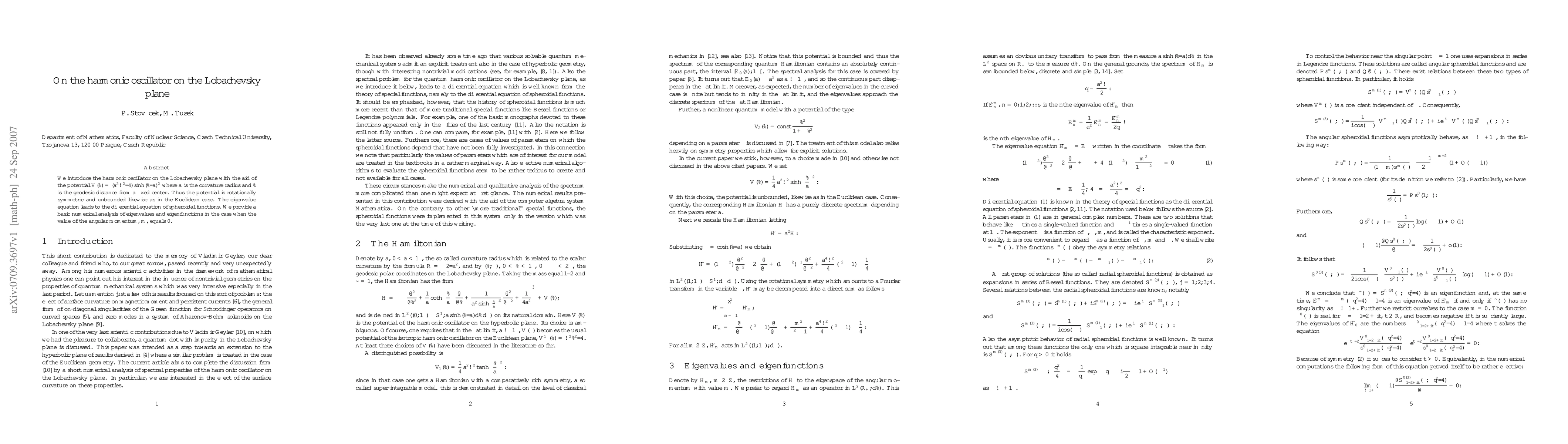 We introduce the harmonic oscillator on the Lobachevsky plane with the aid of the potential $V(r)=(a^2\omega^2/4)sinh(r/a)^2$ where $a$ is the curvature radius and $r$ is the geodesic distance from a fixed center. Thus the potential is rotationally symmetric and unbounded likewise as in the Euclidean case. The eigenvalue equation leads to the differential equation of spheroidal functions. We provide a basic numerical analysis of eigenvalues and eigenfunctions in the case when the value of the angular momentum, $m$, equals 0.