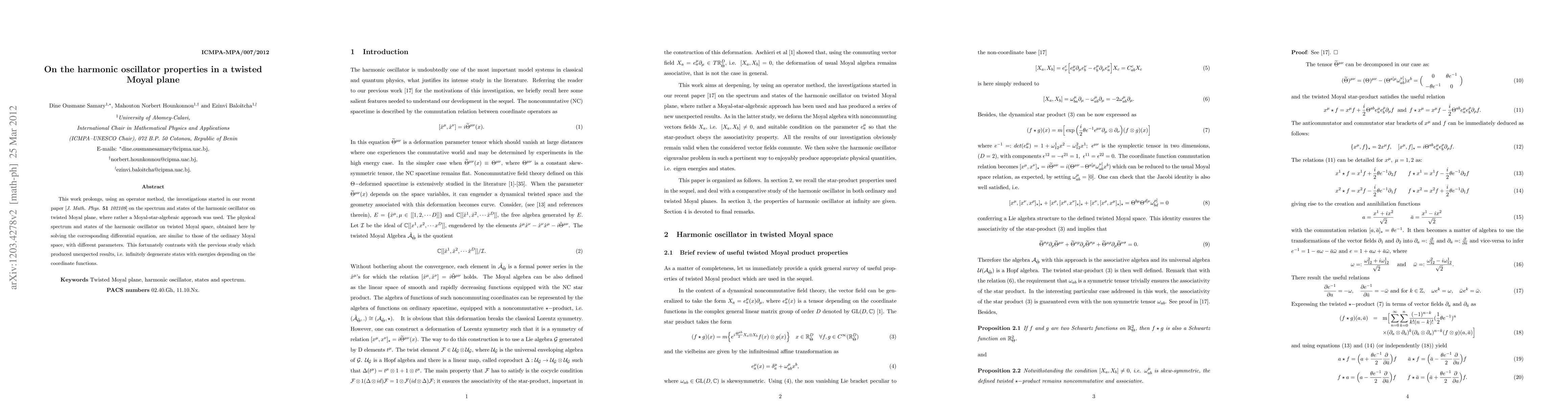 This paper extends the study of the harmonic oscillator on a twisted Moyal plane using an operator method, finding a spectrum and states similar to those on ordinary Moyal space, contrasting previous unexpected results of infinitely degenerate states.
