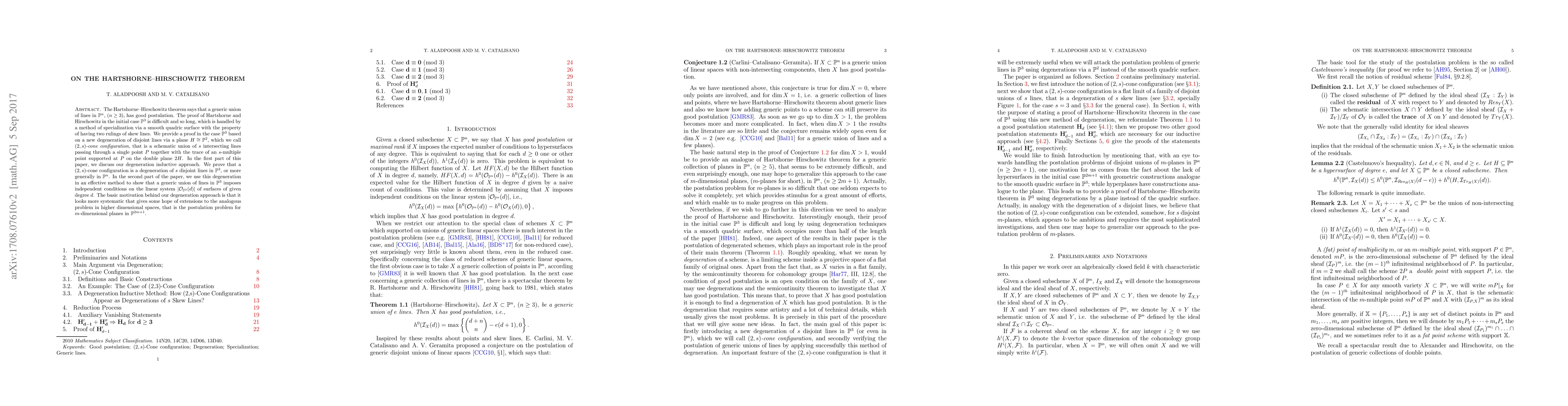 The Hartshorne--Hirschowitz theorem says that a generic union of lines in $\mathbb{P}^n$, $(n\geq 3)$, has good postulation. The proof of Hartshorne and Hirschowitz in the initial case $\mathbb{P}^3$ is difficult and so long, which is handled by a method of specialization via a smooth quadric surface with the property of having two rulings of skew lines. We provide a proof in the case $\mathbb{P}^3$ based on a new degeneration of disjoint lines via a plane $H\cong\mathbb{P}^2$, which we call $(2,s)$-cone configuration, that is a schematic union of $s$ intersecting lines passing through a single point $P$ together with the trace of an $s$-multiple point supported at $P$ on the double plane $2H$. In the first part of this paper, we discuss our degeneration inductive approach. We prove that a $(2,s)$-cone configuration is a degeneration of $s$ disjoint lines in $\mathbb{P}^3$, or more generally in $\mathbb{P}^n$. In the second part of the paper, we use this degeneration in an effective method to show that a generic union of lines in $\mathbb{P}^3$ imposes independent conditions on the linear system $|\mathbb{O}_{\mathbb{P}^3}(d)|$ of surfaces of given degree $d$. The basic motivation behind our degeneration approach is that it looks more systematic that gives some hope of extensions to the analogous problem in higher dimensional spaces, that is the postulation problem for $m$-dimensional planes in $\mathbb{P}^{2m+1}$.