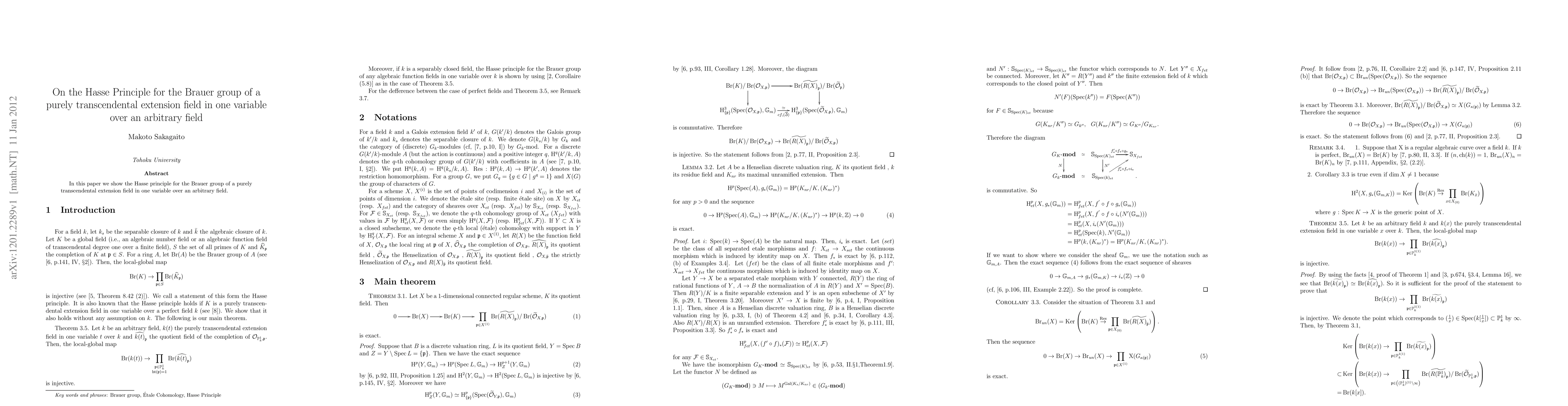 In this paper we show the Hasse principle for the Brauer group of a purely transcendental extension field in one variable over an arbitrary field.