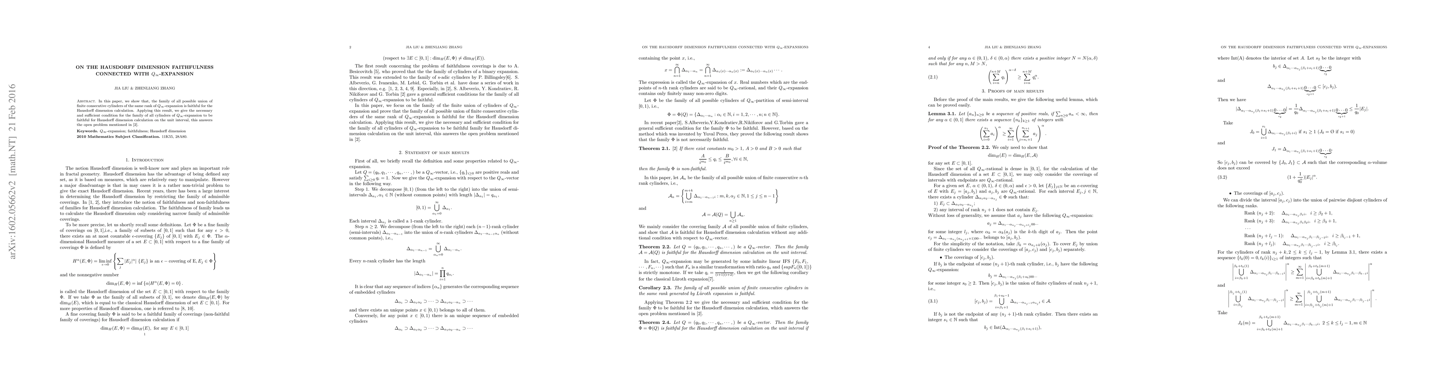 The paper proves that a specific family of union of finite consecutive cylinders in Q_infinity-expansion is faithful for Hausdorff dimension calculation, answering an open problem on the unit interval.