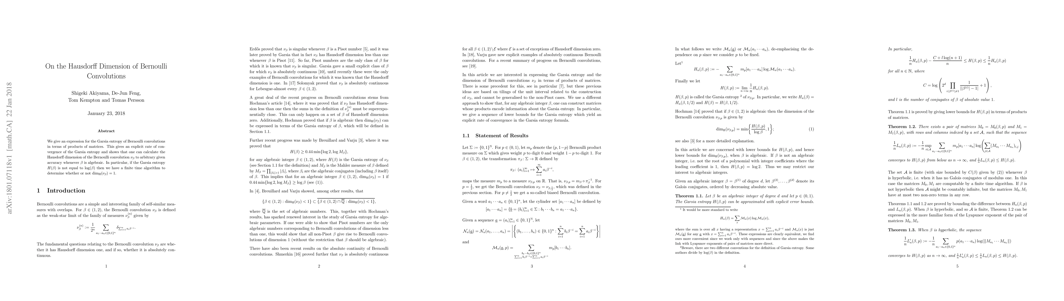 Researchers found a way to calculate the Hausdorff dimension of Bernoulli convolutions with arbitrary accuracy, even for algebraic values of β, by expressing Garsia entropy in terms of matrix products.