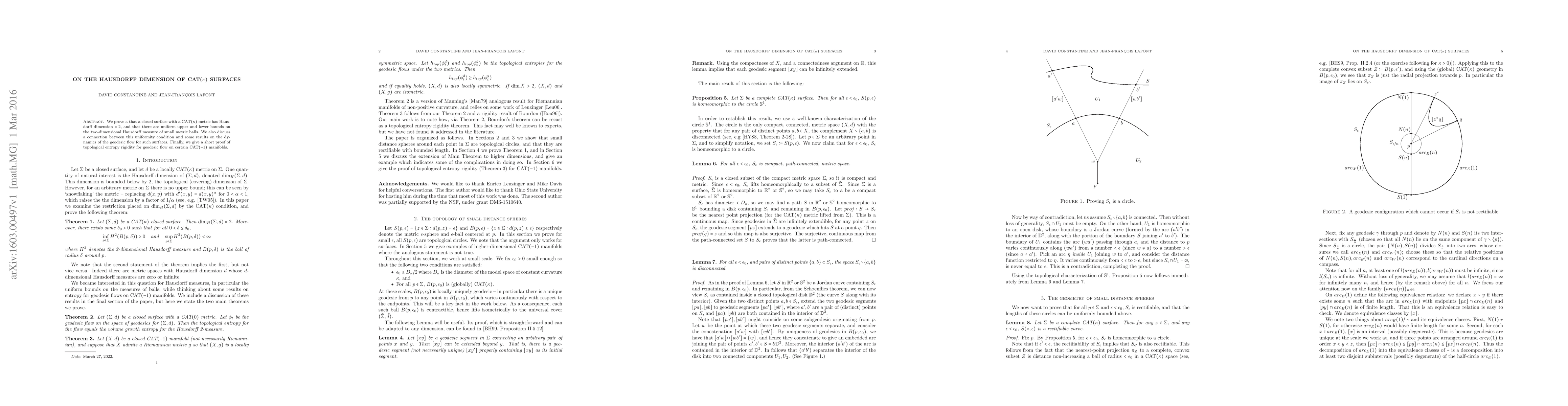 This paper proves that closed CAT($\kappa$) surfaces maintain a Hausdorff dimension of 2 and establishes uniform bounds on the two-dimensional Hausdorff measure of small metric balls. It also explores connections between these uniformity conditions and the dynamics of geodesic flows on such surfaces, concluding with a proof of topological entropy rigidity for geodesic flow on specific CAT(-1) manifolds.
