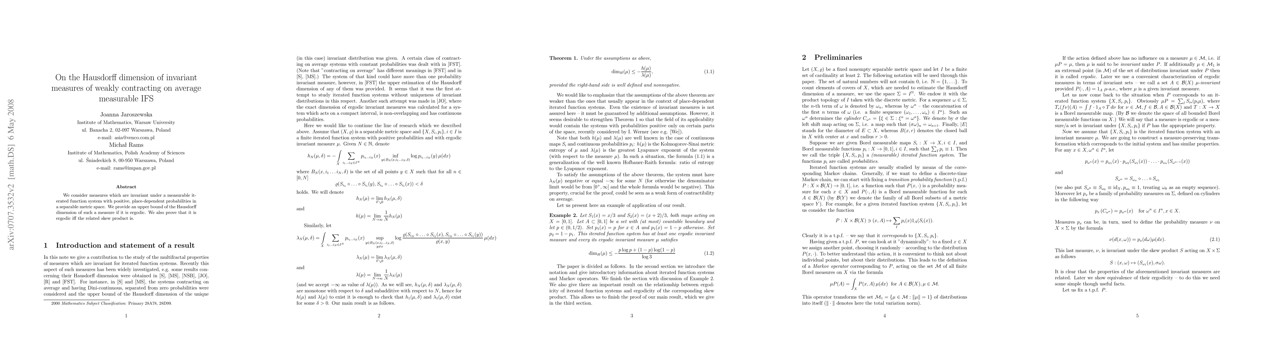 A study on invariant measures of weakly contracting iterated function systems (IFS) establishes an upper bound for the Hausdorff dimension of such measures when they are ergodic, and shows that ergodicity is equivalent to a related skew product system.