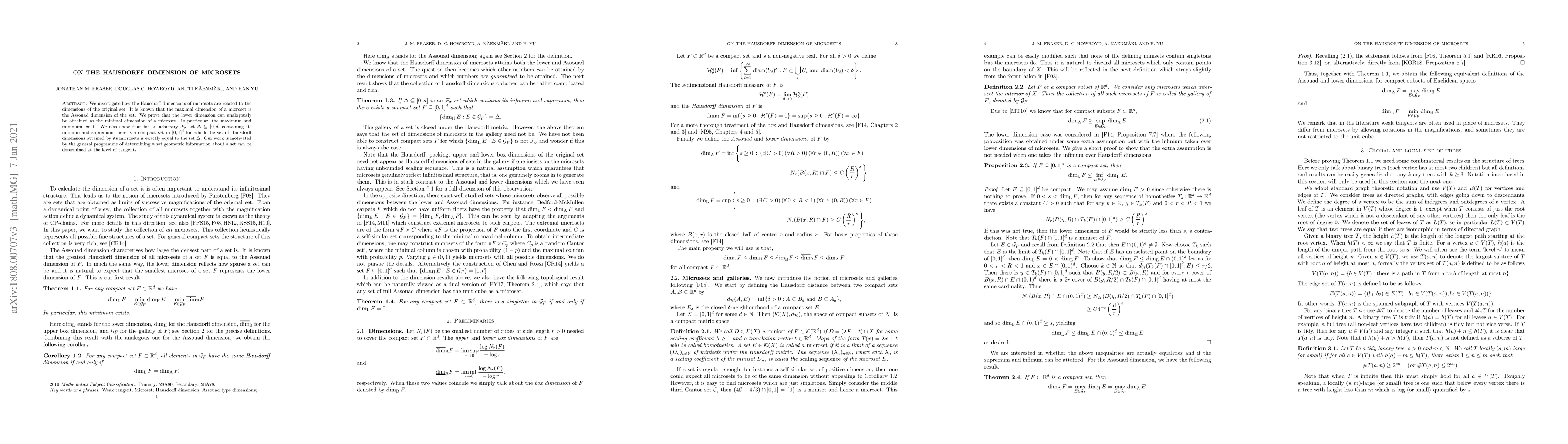 This paper investigates the relationship between the Hausdorff dimensions of microsets and their parent sets, finding that maximal dimension is known as Assouad dimension and minimal dimension can be obtained from minimal dimension of a microset. It also shows that for certain sets, the set of Hausdorff dimensions attained by its microsets matches a given interval.