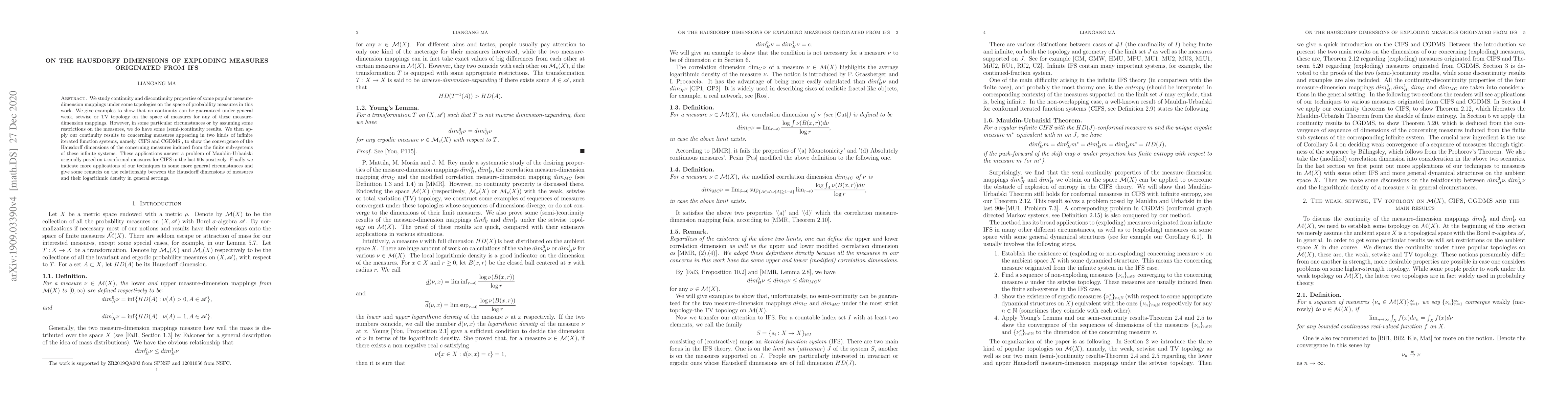 We study continuity and discontinuity properties of some popular measure-dimension mappings under some topologies on the space of probability measures in this work. We give examples to show that no continuity can be guaranteed under general weak, setwise or TV topology on the space of measures for any of these measure-dimension mappings. However, in some particular circumstances or by assuming some restrictions on the measures, we do have some (semi-)continuity results. We then apply our continuity results to concerning measures appearing in two kinds of infinite iterated function systems, namely, CIFS and CGDMS , to show the convergence of the Hausdorff dimensions of the concerning measures induced from the finite sub-systems of these infinite systems. These applications answer a problem of Mauldin-Urba\'nski originally posed on $t$-conformal measures for CIFS in the last 90s positively. Finally we indicate more applications of our techniques in some more general circumstances and give some remarks on the relationship between the Hausdorff dimensions of measures and their logarithmic density in general settings.
