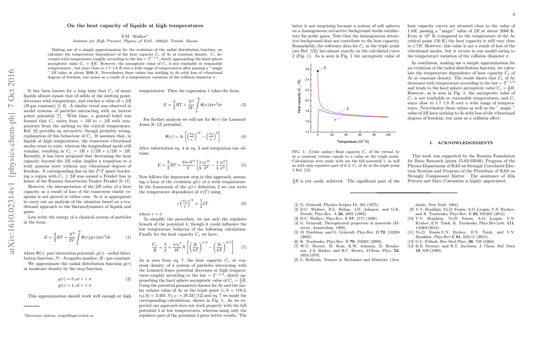 Making use of a simple approximation for the evolution of the radial distribution function, we calculate the temperature dependence of the heat capacity $C_v$ of Ar at constant density. $C_v$ decreases with temperature roughly according to the law $\sim T^{-1/4}$, slowly approaching the hard sphere asymptotic value $C_v=\frac{3}{2}R$. However, the asymptotic value of $C_v$ is not reachable at reasonable temperatures , but stays close to 1.7--1.8 $R$ over a wide range of temperatures after passing a " magic " $2R$ value at about 2000 K. Nevertheless these values has nothing to do with loss of vibrational degrees of freedom, but arises as a result of a temperature variation of the collision diameter $\sigma$. \end{abstract}
