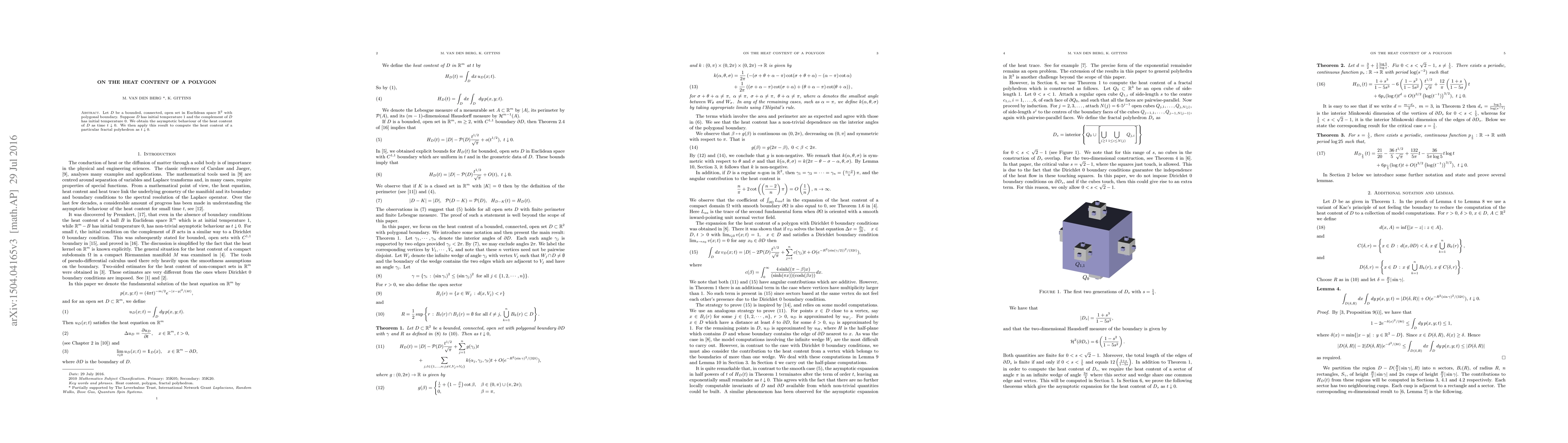Let $D$ be a bounded, connected, open set in Euclidean space $\mathbb{R}^{2}$ with polygonal boundary. Suppose $D$ has initial temperature $1$ and the complement of $D$ has initial temperature $0$. We obtain the asymptotic behaviour of the heat content of $D$ as time $t \downarrow 0$. We then apply this result to compute the heat content of a particular fractal polyhedron as $t \downarrow 0$.
