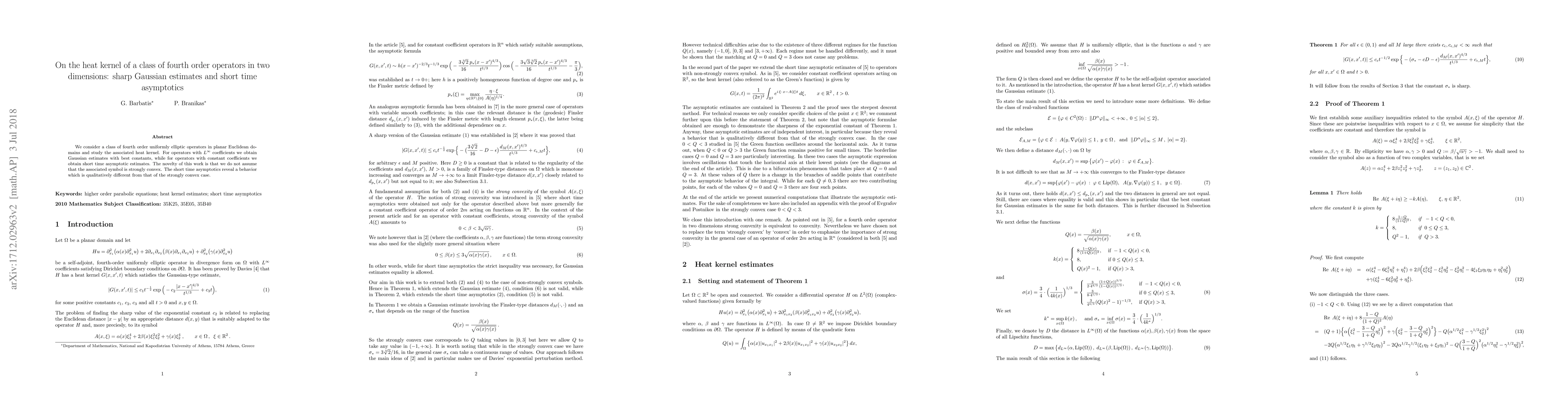 This paper investigates the heat kernel of a class of fourth-order uniformly elliptic operators in two dimensions, achieving sharp Gaussian estimates for operators with $L^{\infty}$ coefficients and short time asymptotics for those with constant coefficients. Notably, the study does not require the associated symbol to be strongly convex, revealing distinct short time behaviors.