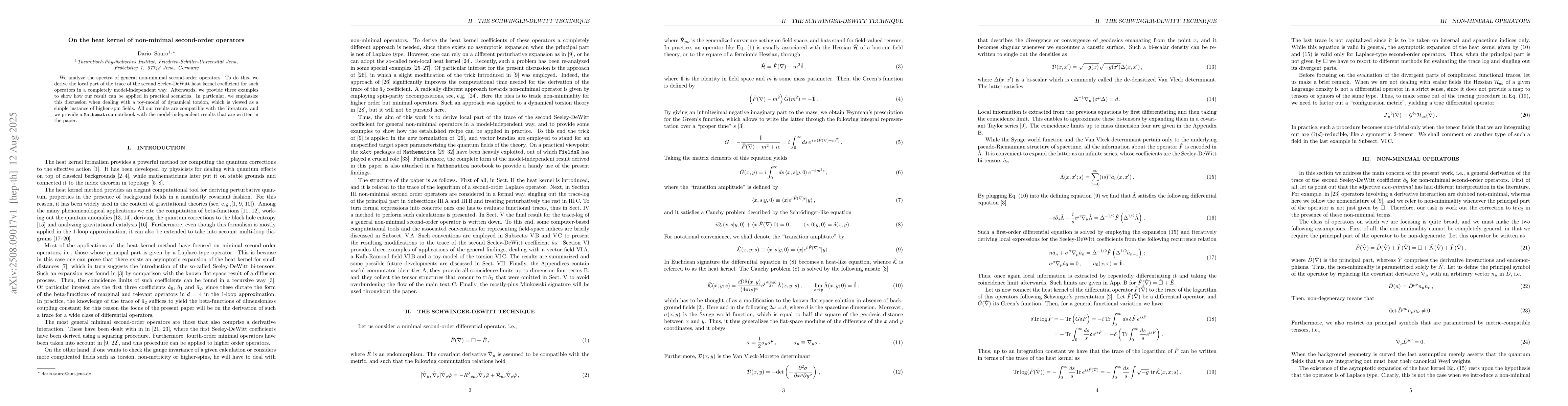 We analyze the spectra of general non-minimal second-order operators. To do this, we derive the local part of the trace of the second Seeley-DeWitt heat kernel coefficient for such operators in a completely model-independent way. Afterwards, we provide three examples to show how our result can be applied in practical scenarios. In particular, we emphasize this discussion when dealing with a toy-model of dynamical torsion, which is viewed as a simple instance of higher-spin fields. All our results are compatible with the literature, and we provide a Mathematica notebook with the model-independent results that are written in the paper.